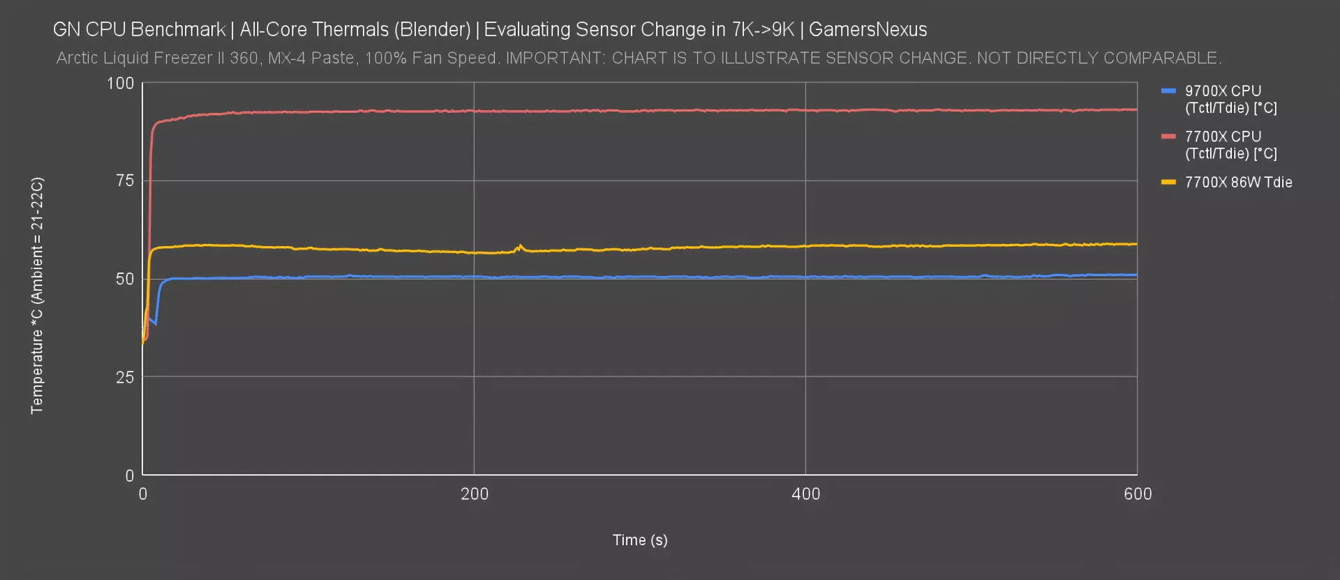 Unveiling the 7700X at the same power, we see it’s now at about 59 degrees Celsius. As compared to the 9700X, this helps us understand two things. One is whatever the actual improvements there may be and the other is the change to the sensor behavior itself. This is much more directly comparable to the 9700X. It is as close as we can get without external sensors and the end result is closer to an 8 or maybe 9 degree change depending on where you look on the chart. So this makes sense and AMD’s previous claims were approximately 7 degrees Celsius at the same TDP. We're actually remarkably close for this approach so this would be the closest we can get to a real comparison. Although it'd be one hell of a story to say that AMD reduced it by 40 degrees, it's really just not that simple.