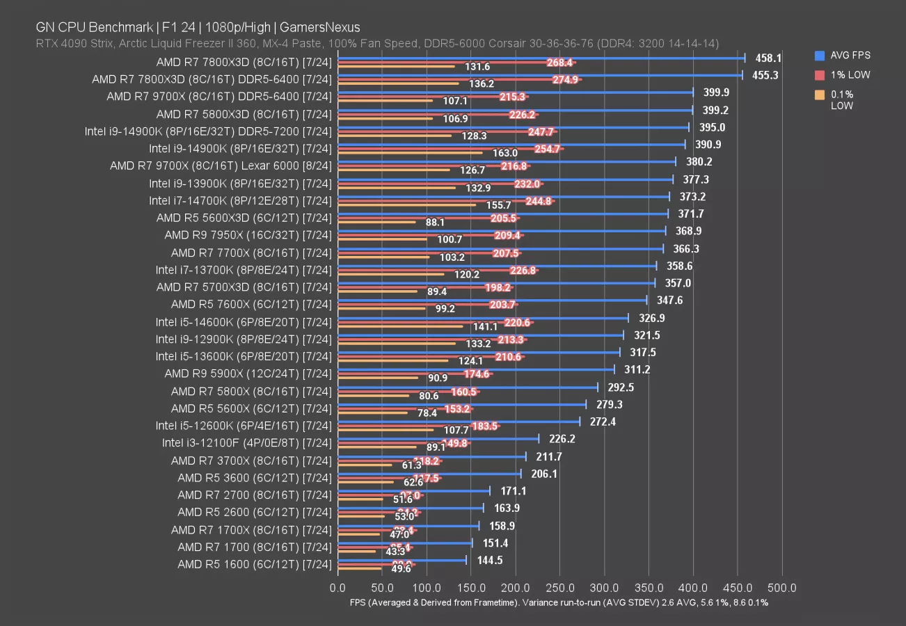 The higher spec memory helped it here, but remember that applying the same memory to the 7700X would likely yield another result nearing equivalence. Still, this is one of the few games where we saw uplift on the 9700X with the faster spec memory. The 7800X3D (watch our review) didn’t seem to benefit much from it, but this is consistent with less reliance on memory in general due to the larger cache.