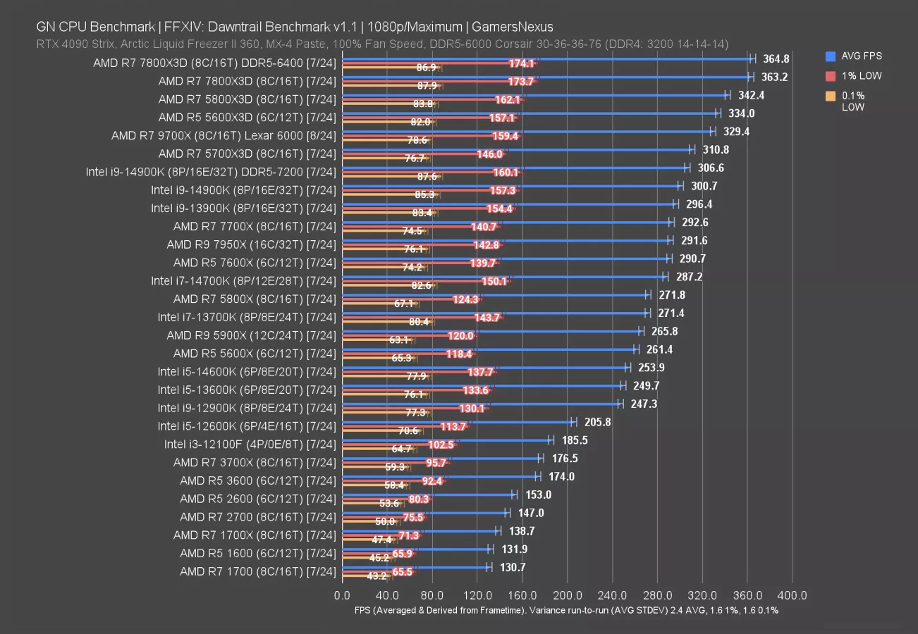 Final Fantasy 14: Dawntrail is up now. This is a brand new, 2024 update to FFXIV and includes a complete overhaul of graphics and other systems. It also totally changes how Intel and AMD behave on these charts in relation to each other.