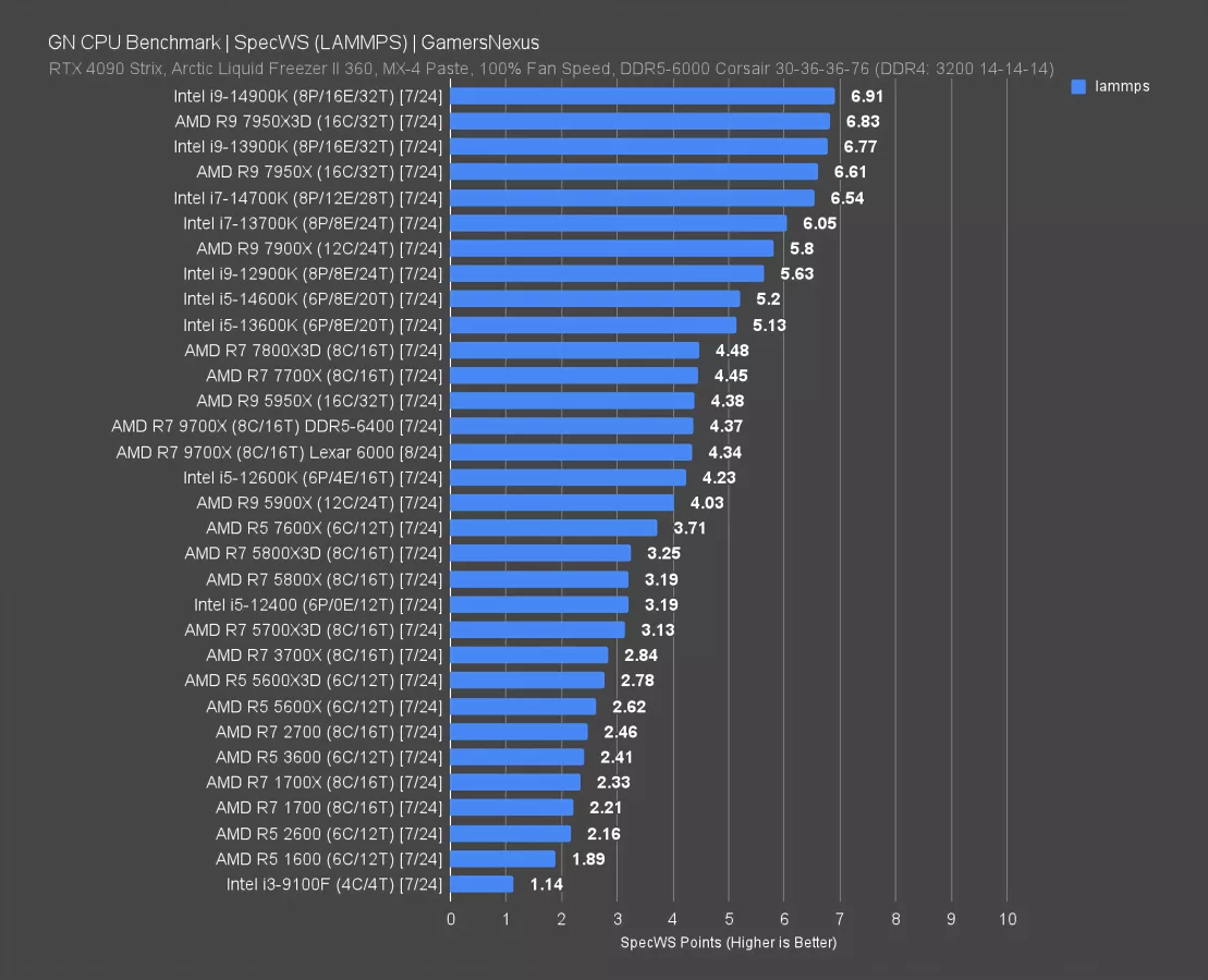 In LAMMPS, we’re seeing regressive performance again. It doesn’t happen often, but the 7700X’s 4.45 result leads the 9700X by 2.5%. Some of this may be due to the slightly different memory timings as a result of the compatibility trouble, but that shouldn’t account for the whole difference. The 9700X is just disappointing as compared to the 7700X in this one.