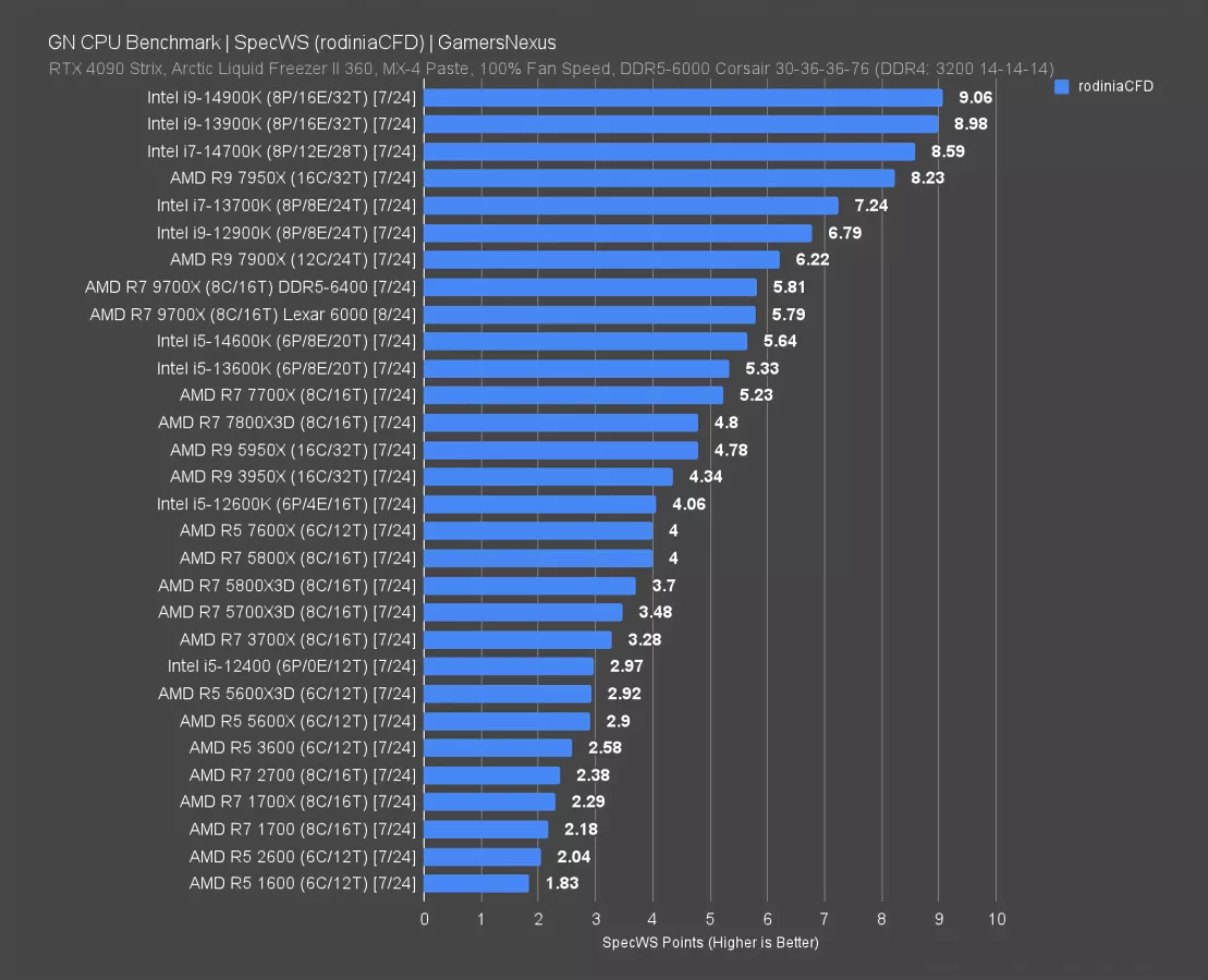 The 5900X, 3950X, and even 14600K all run ahead of the 9700X. AMD’s performance here is embarrassing and fails to move the needle. There is absolutely no reason to buy this CPU for workloads like this unless you were going to buy a 7700X anyway and if this is cheaper. Both of those conditions would have to be true.