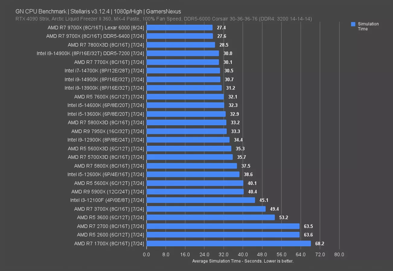 Starfield is just embarrassing for AMD. The 9700X technically is below the 7700X here, but in reality, they’re about equal. This may explain why AMD stalled this launch. We’ve seen this with AMD in the past -- notably, the 5950X and 3950X (watch our review) in some production tests -- but this is just sad for the 9700X. It would have to be a good deal cheaper to matter.
