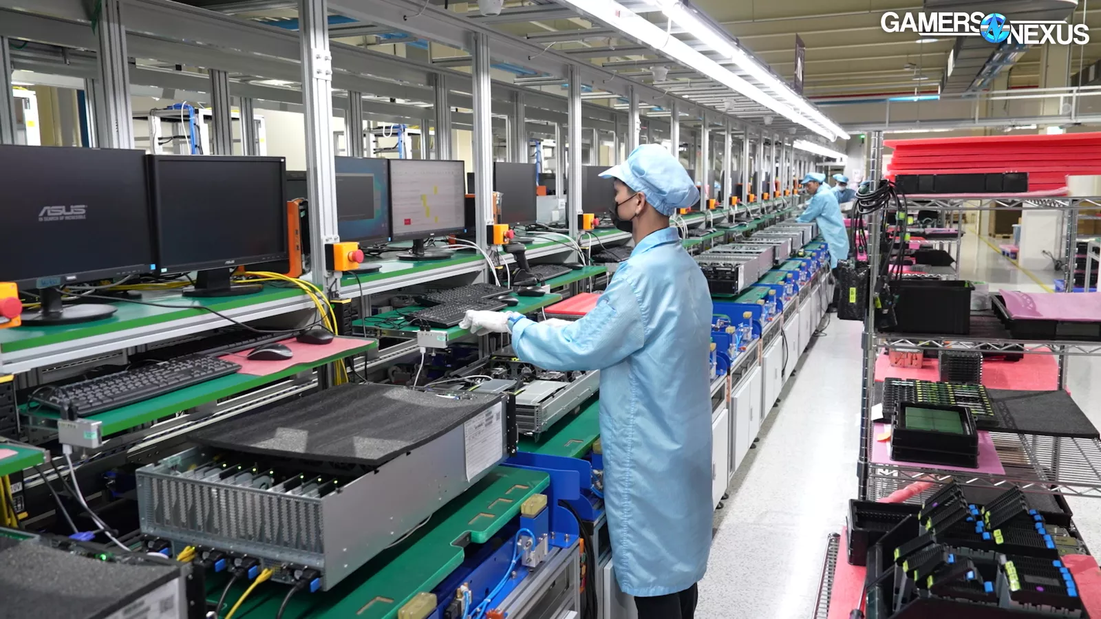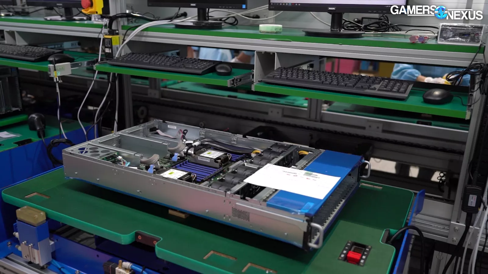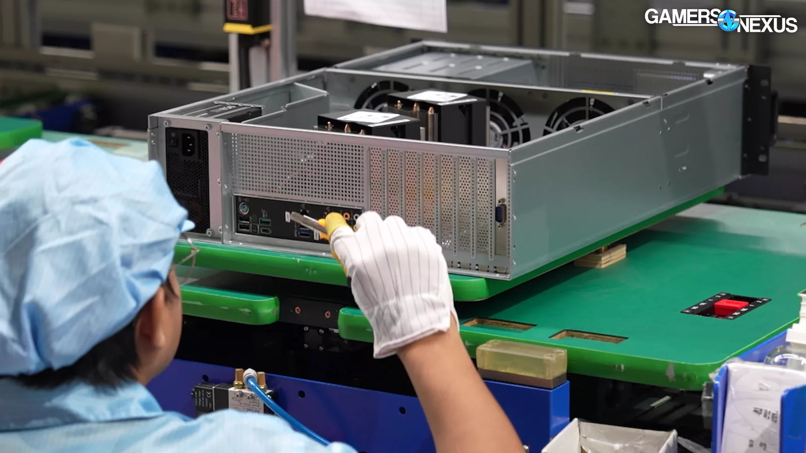 A different line is configured for 2U systems due to changes in process. For full configurations with maximized RAM, an assembly line crew might socket upwards of 1,000 sticks per day. We’re betting the job application asks how strong your thumbs are.