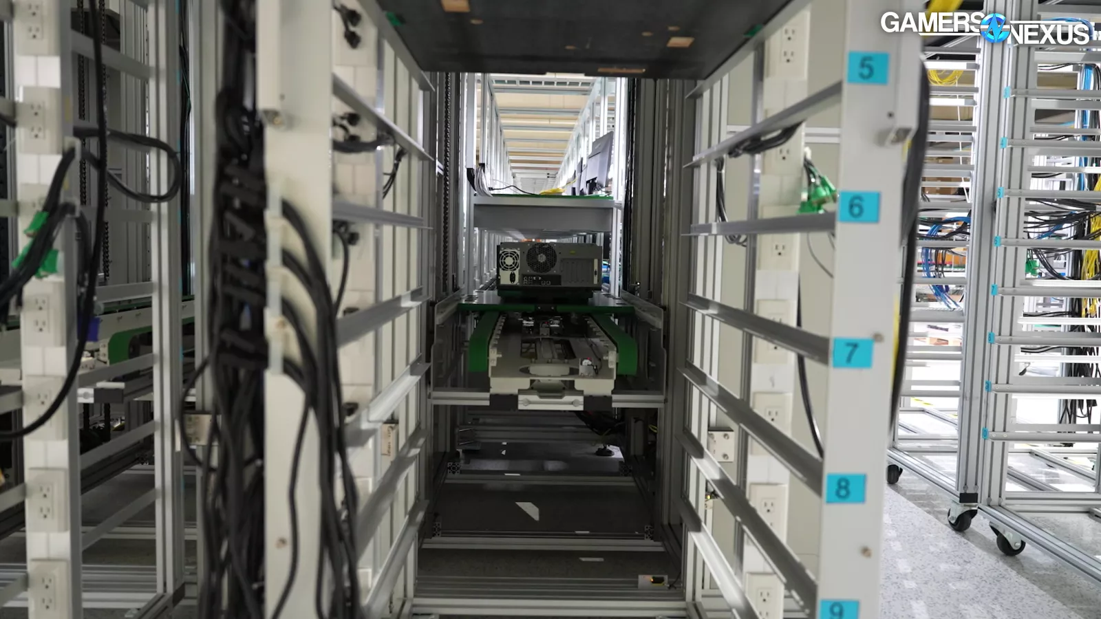 The test racks in this area cycle through I/O testing to make sure all ports fire, CPU burn-in, cooler burn-in, and even testing the entire RPM range for the fan. And it sounds kind of like a deafening aircraft carrier when they all fire at once.