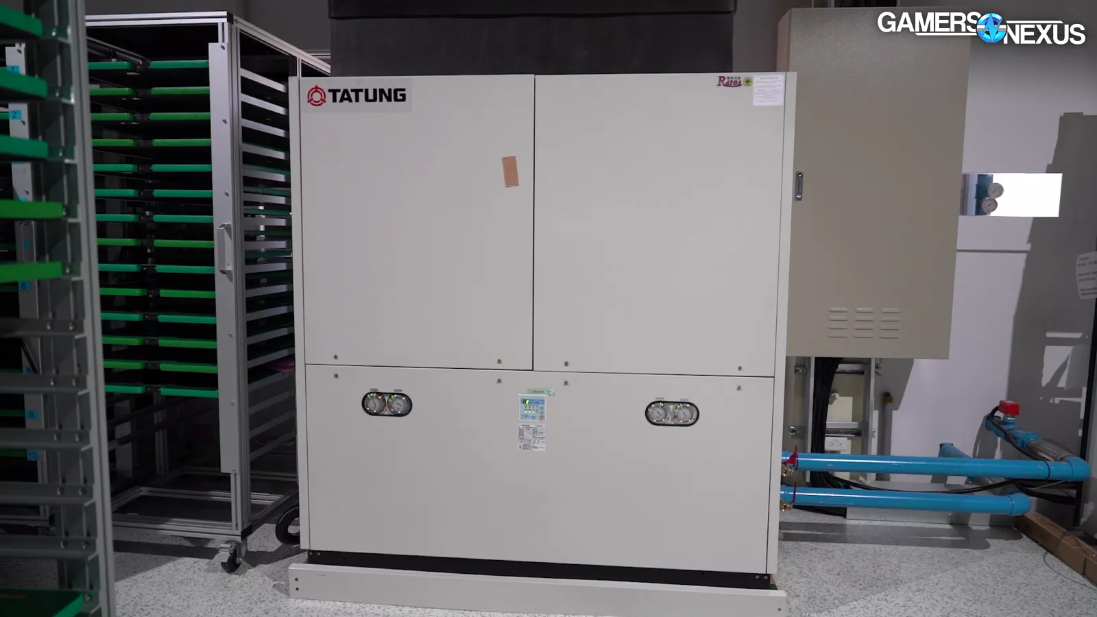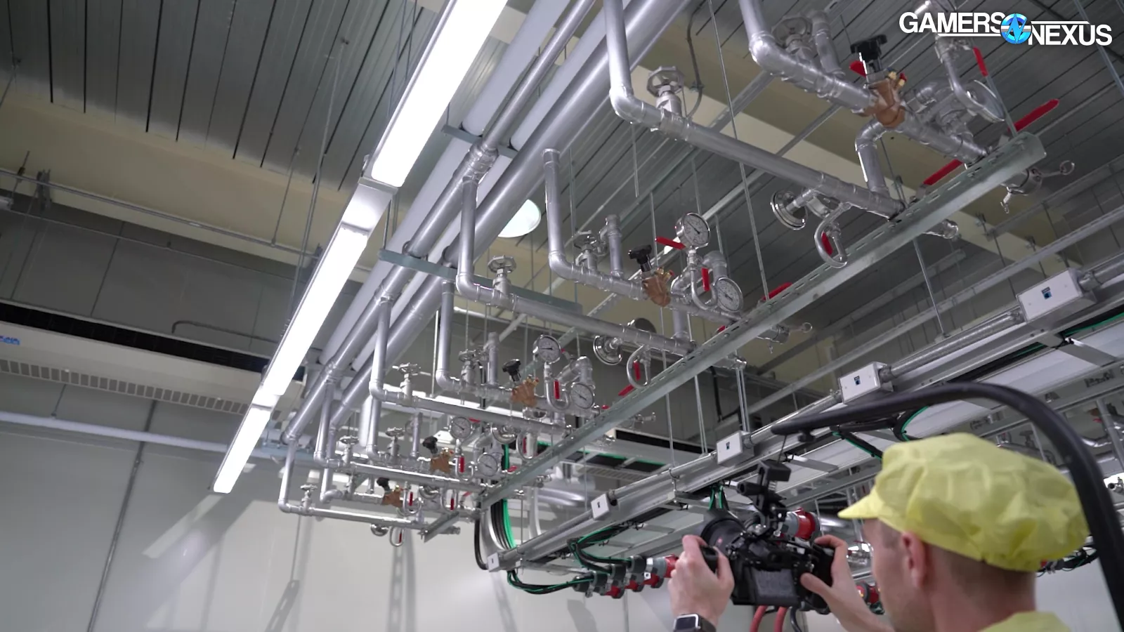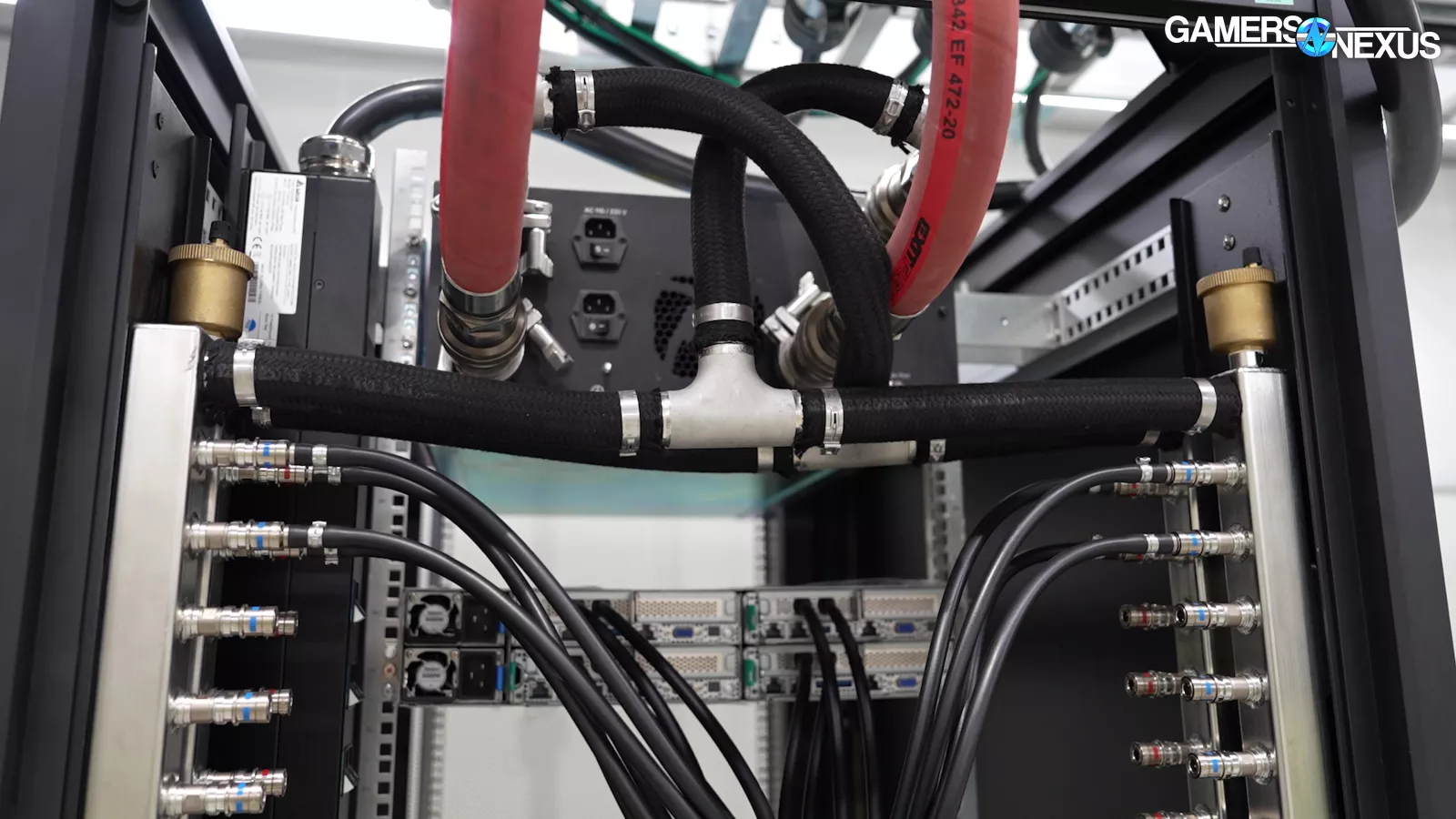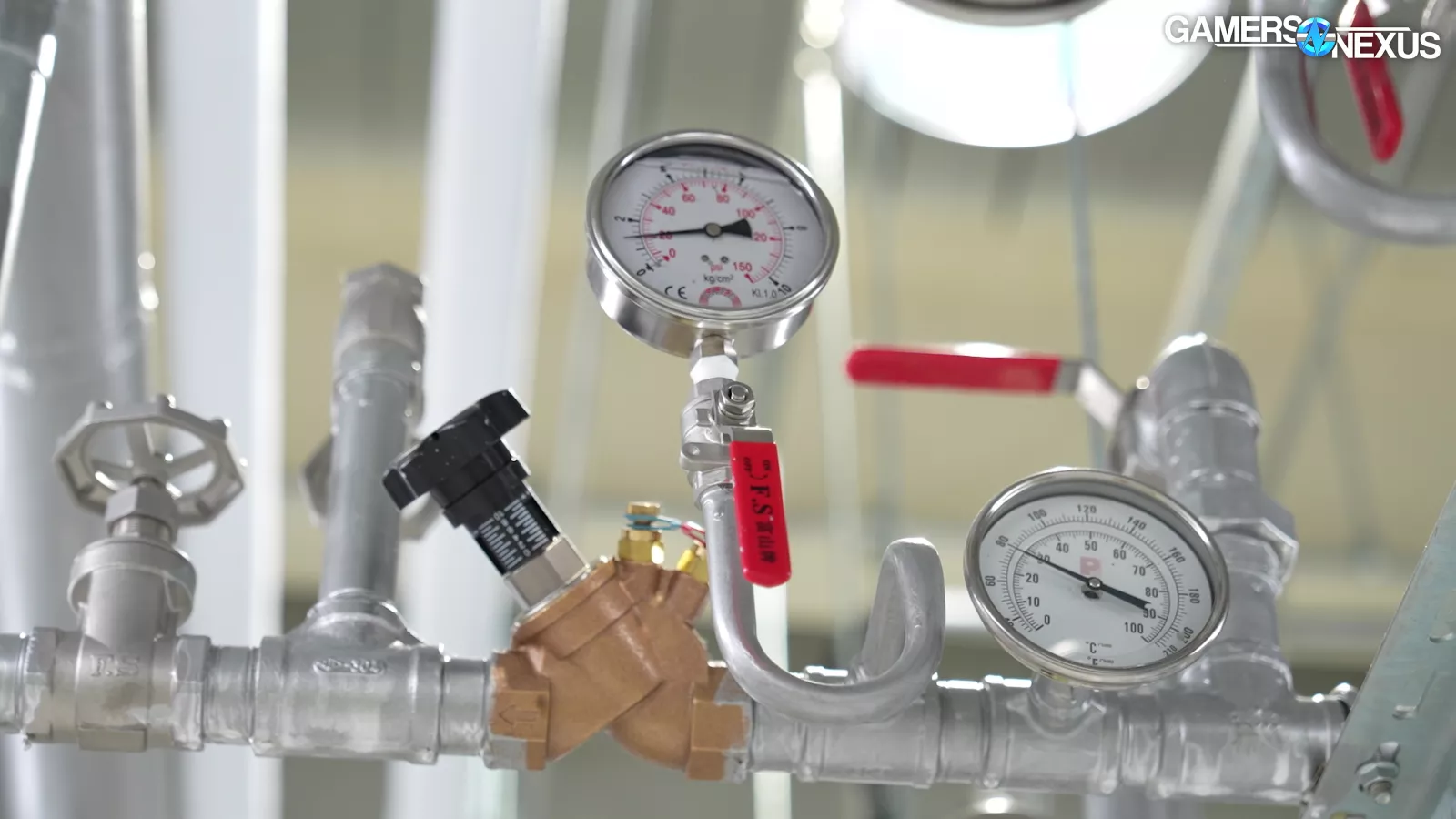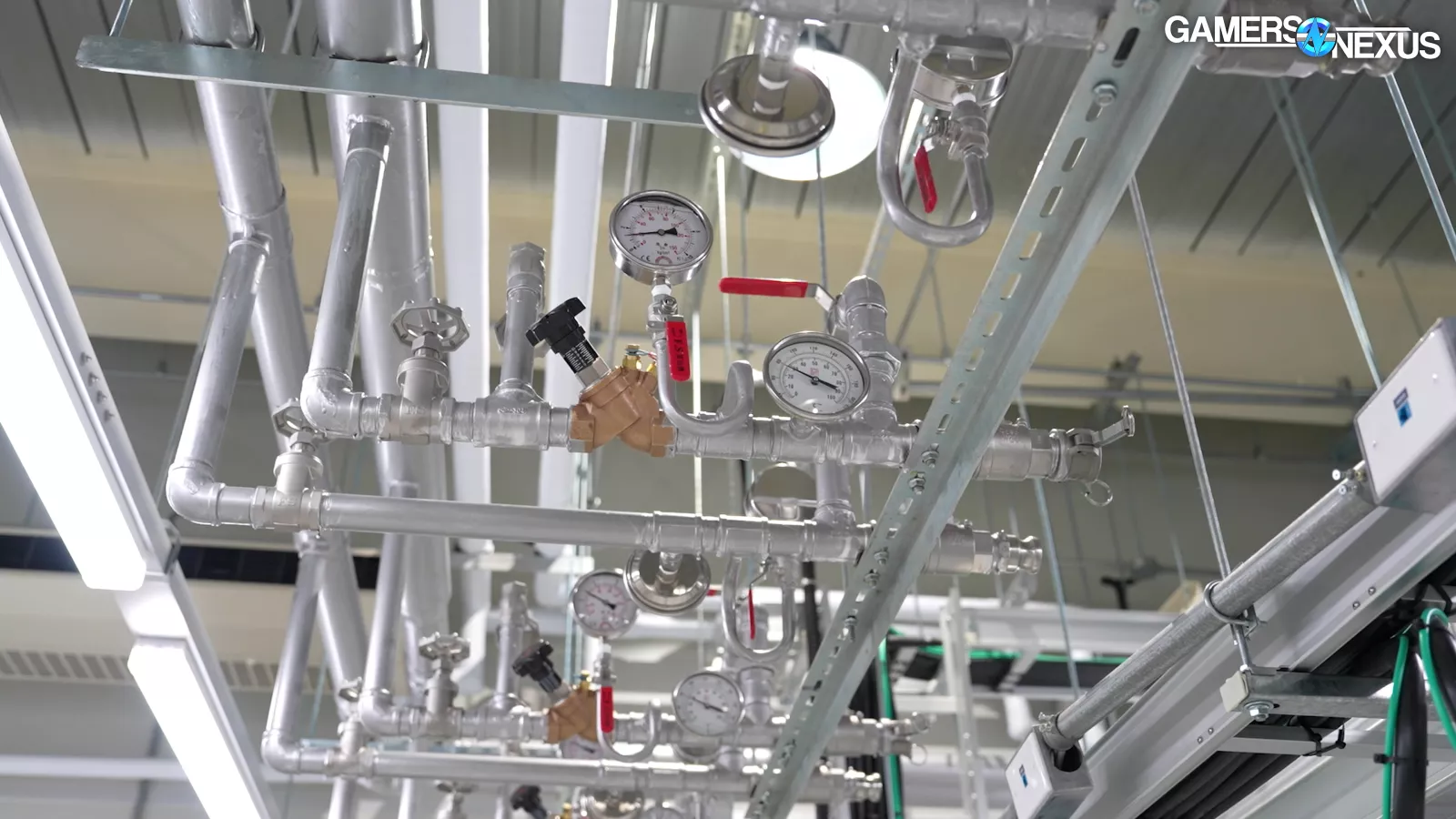 The water pumps through these huge hoses, with pressure gauges placed throughout to help check for leaks. They’re also checking the water temperature here. This can be configured to test water cooling for entire server racks -- or multiple -- for complex systems.