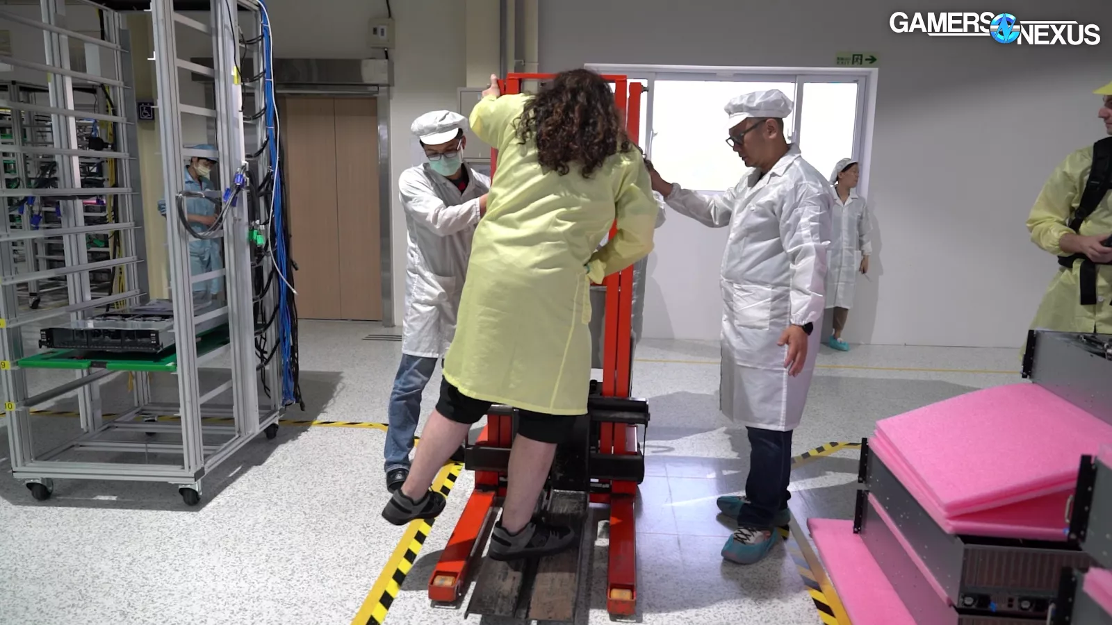 Standing atop a pallet stacker, Steve held the position above for about 5 minutes to get the shot below as we waited for InWin to send a server across.