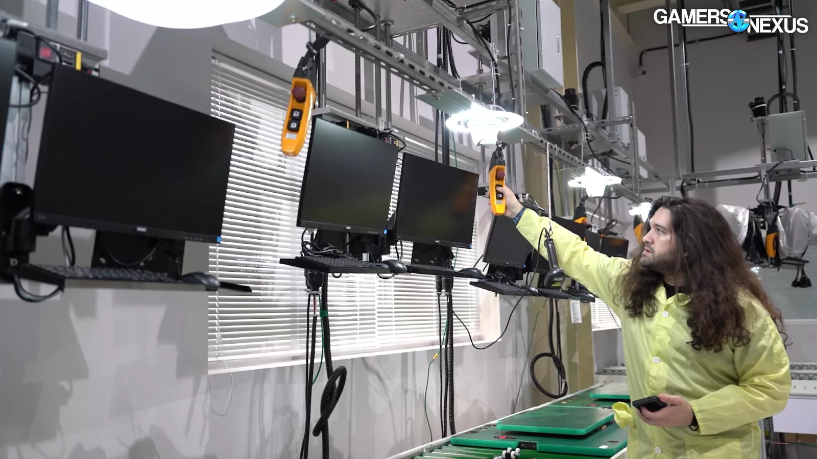Steve was briefly assigned a job he couldn’t possibly screw up: Move the monitors up and down with a button. These stations are also used for documentation and photography to keep a record of serial numbers and parts.