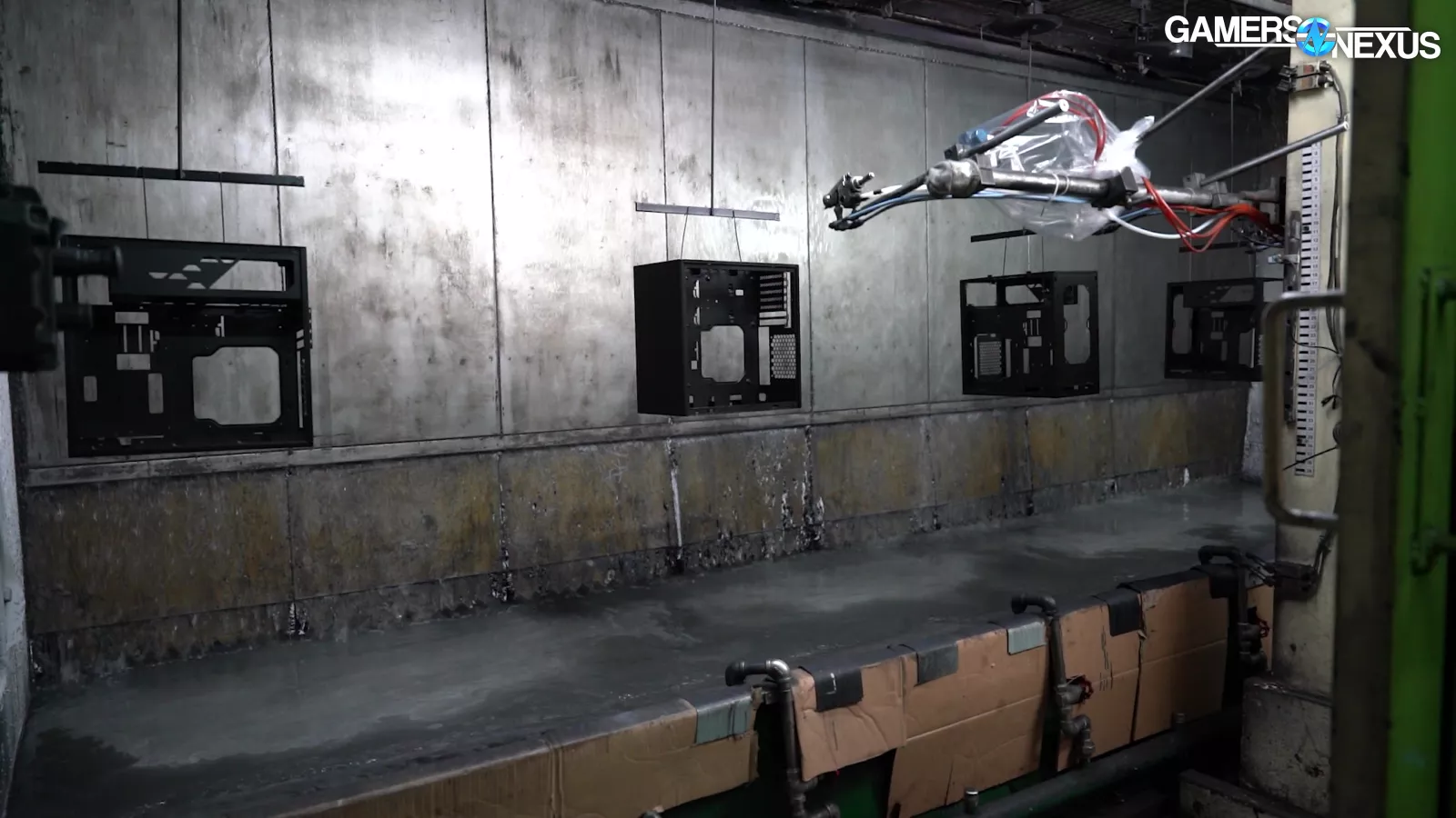 These waterfalls help wash the overspray down into a catch basin mixed with paint and water, amounting to millions upon millions of liters of use annually. The factory is able to recapture and reclaim much of the water and squeeze the paint out -- which is something we showed in a prior Lian Li painting factory tour -- which reduces usage.