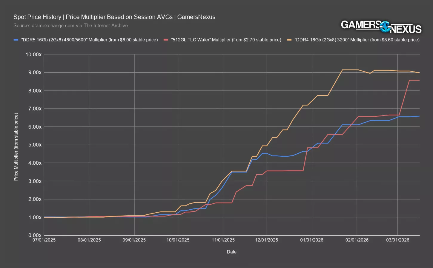This chart plots spot price session AVGs from July 2025 to March 2026 for DDR5 16Gb, 512Gb TLC, and DDR4 16Gb. We collected this data using the Internet Archive to compile a brief spot price history as updated on dramexchange.com. These are supply costs. Contract prices are often different, but spot prices give us an idea for upstream supply chain pricing.