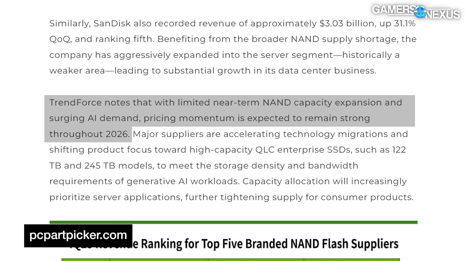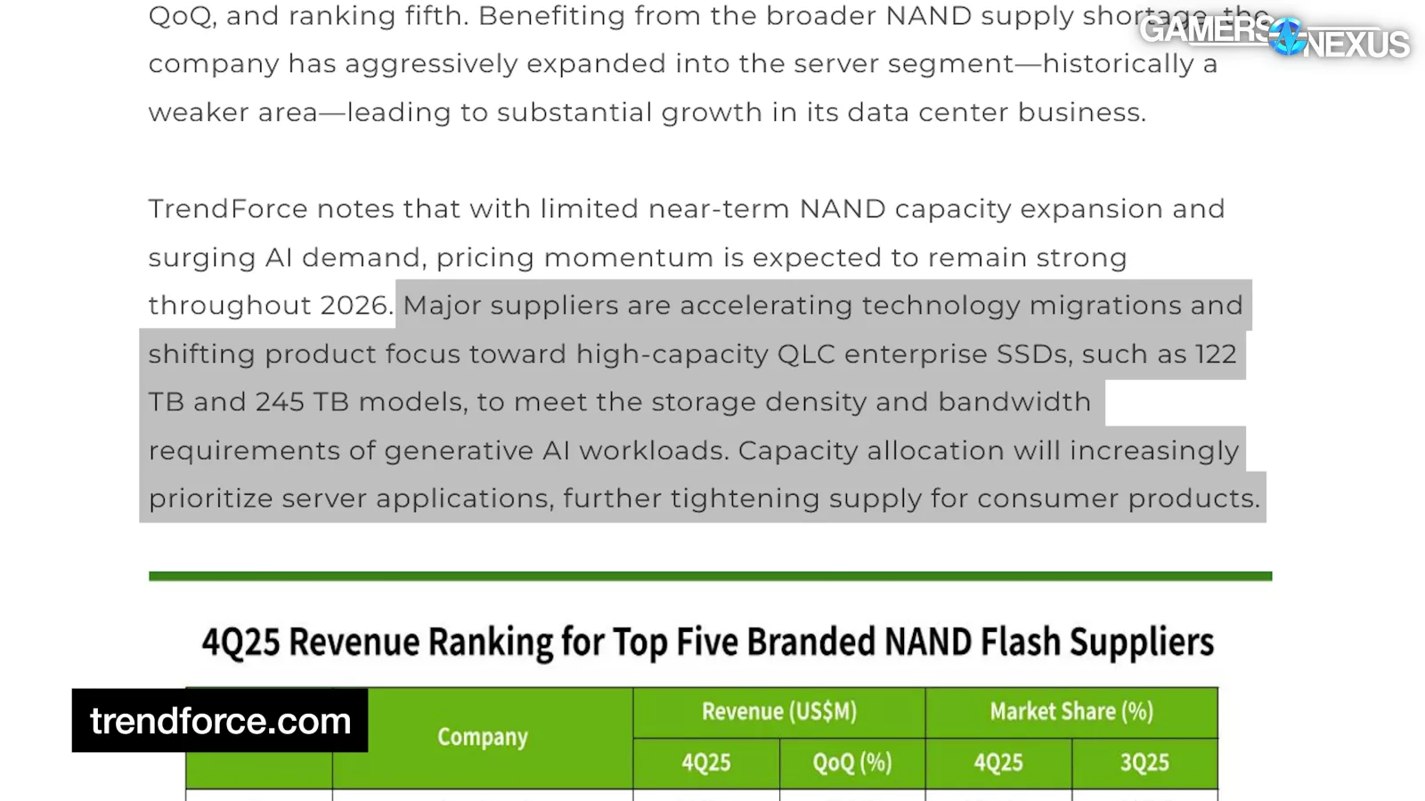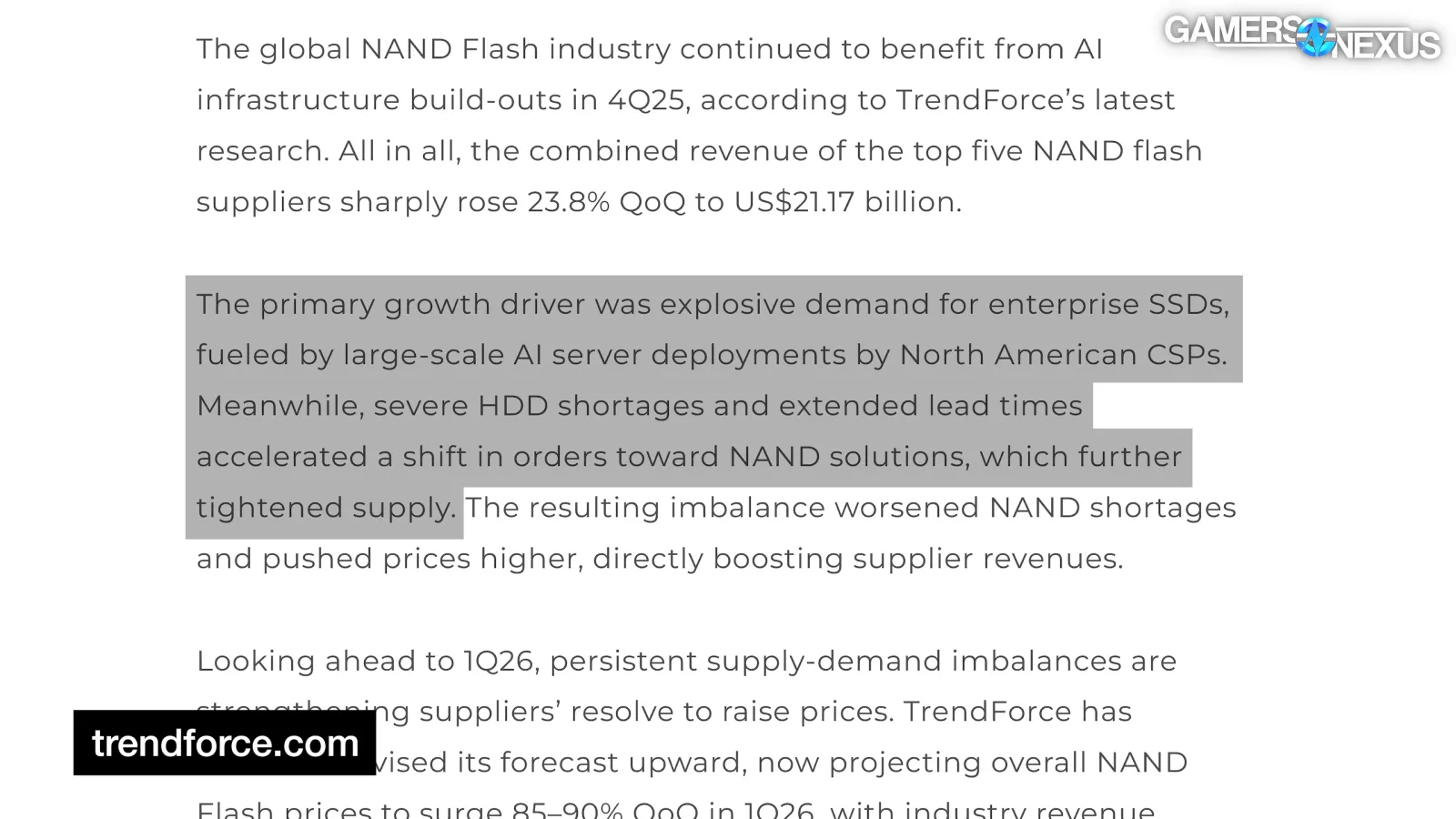 “TrendForce notes that with limited near-term NAND capacity expansion and surging AI demand, pricing momentum is expected to remain strong throughout 2026.”
