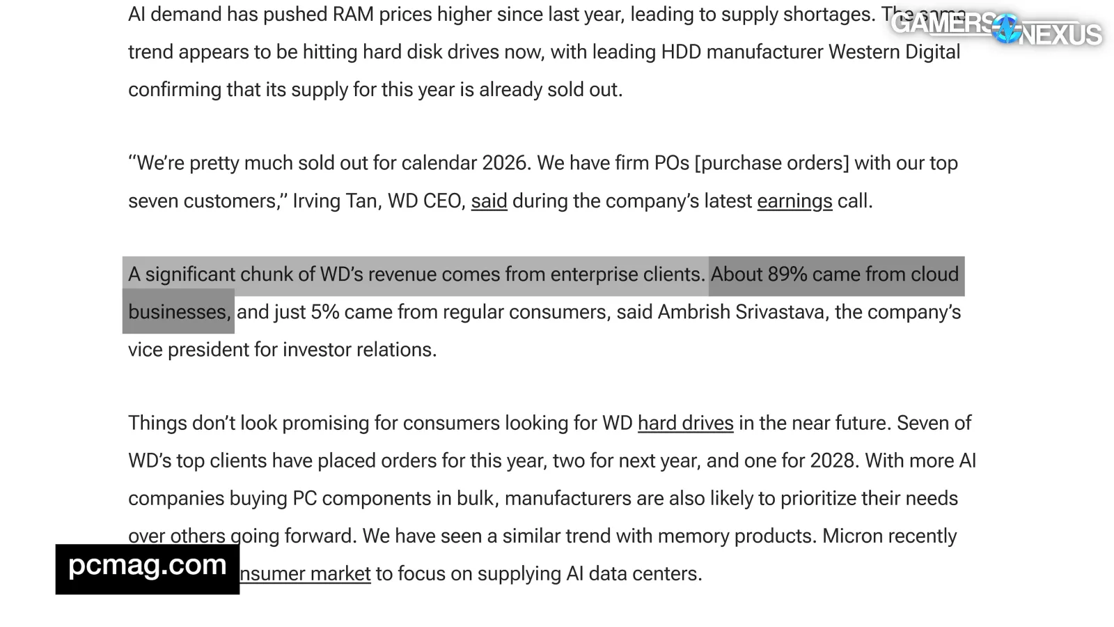 This PC Mag writeup from February notes that AI data centers reserved all of Western Digital’s 2026 supply, quoting Western Digital’s CEO as saying: “We’re pretty much sold out for Calendar 2026. We have firm POs with our top seven customers.” PC Mag noted 89% of WD’s revenue comes from enterprise and cloud service solutions, which would include data centers.