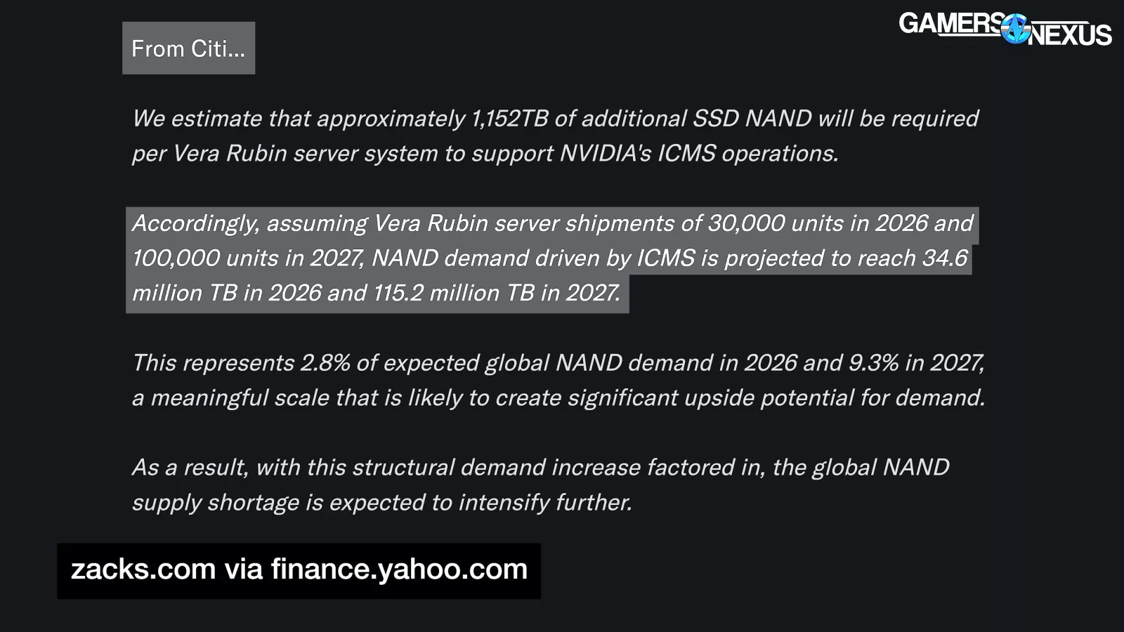 Reported via Yahoo Finance, Citi estimates that “NAND demand driven by ICMS,” or NVIDIA’s Inference Context Memory Storage platform, is projected to represent “2.8% of expected global NAND demand in 2026 and 9.3% in 2027,” meaning that NVIDIA will more than triple the storage needs of this specific solution against global NAND demand.