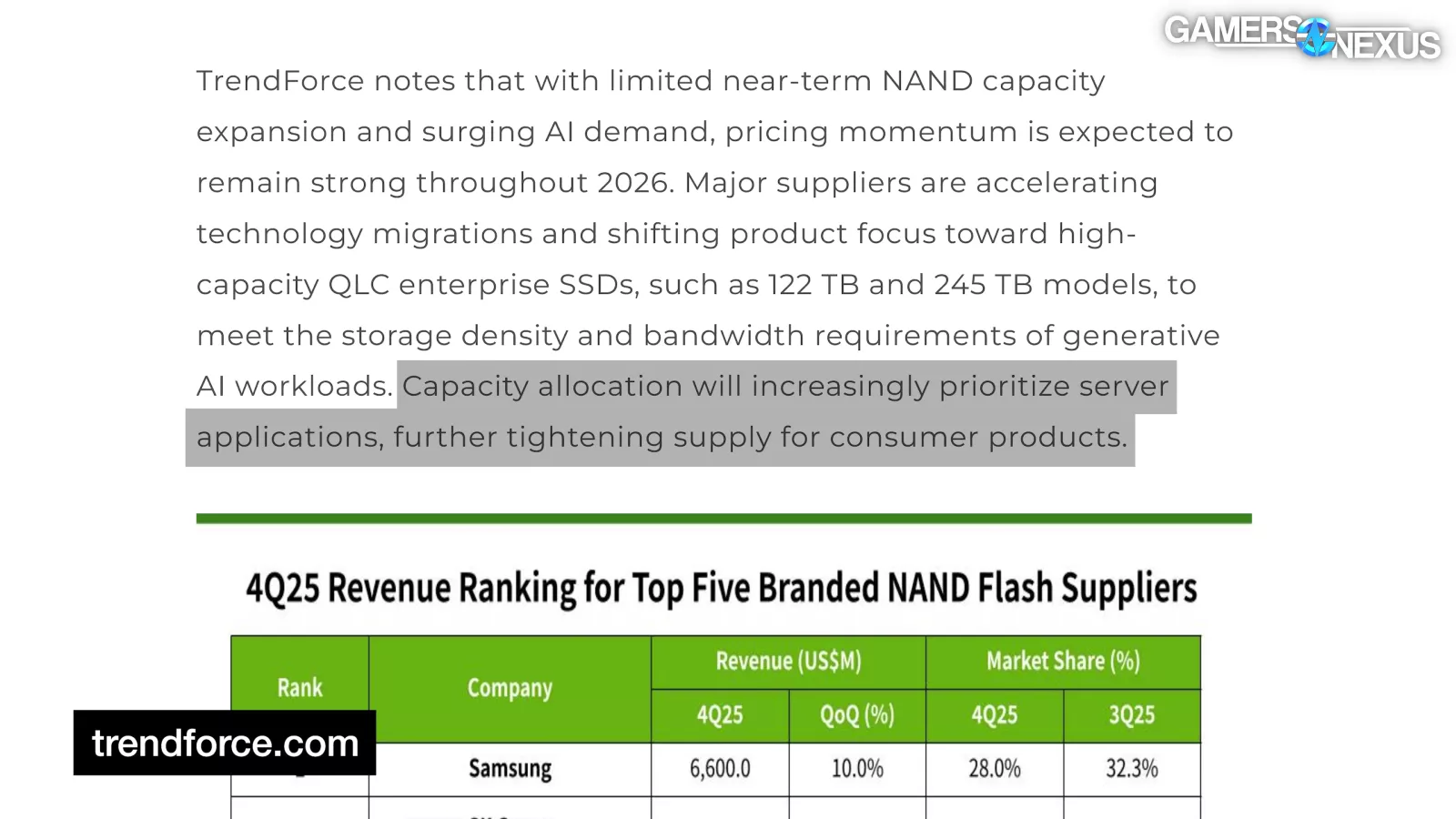 In terms of forecasts, TrendForce’s most recent NAND Flash report reads: