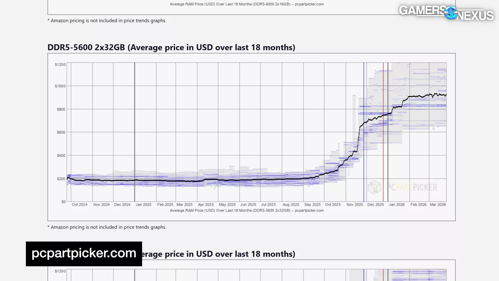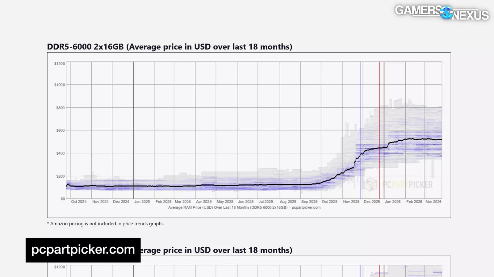 DDR5 16Gb’s session AVG at slower speeds surpassed its previously stable price by 2x just before November, exceeded both 3x and then 4x in November (which is when we made our RAM: WTF? video), and shot 5x and 6x past its previously stable price in January, gradually increasing since. It currently is approaching a 7x multiplier.