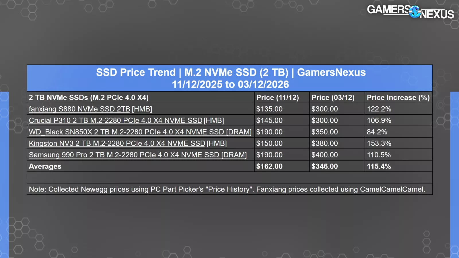 | SSD Price Trend | M.2 NVMe SSD (2 TB) | GamersNexus11/12/2025 to 03/12/2026 | |||