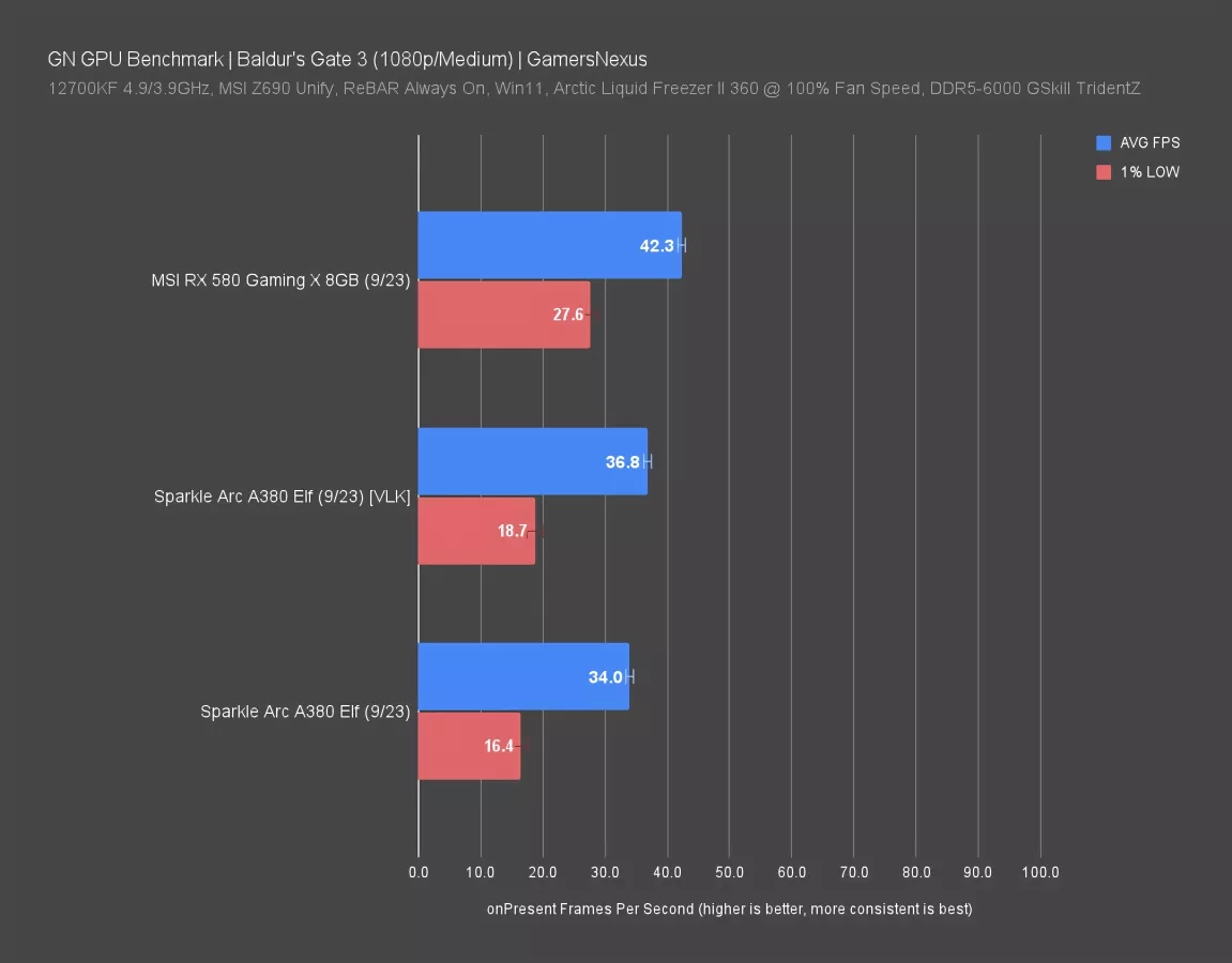 We ran the RX 580 and Arc A380 at Medium as well. There’s not much on this chart since the game is so widely playable – you could play it on modern IGPs and APUs without much trouble. The A380 on Vulkan and RX 580 hover around 37-42FPS AVG at medium.