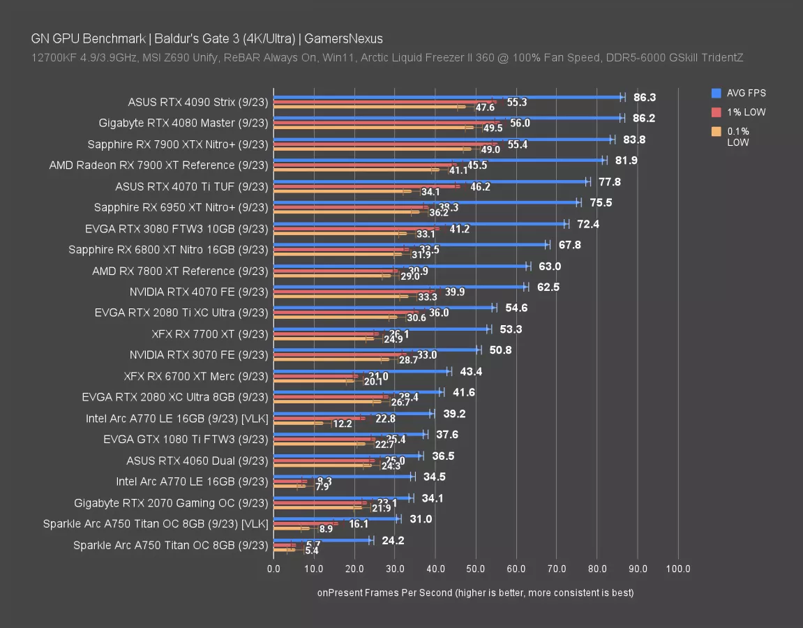 It was fun for us to work on this one. Hopefully, for those of you who are on older hardware, this is helpful to you so you can figure out what might make sense to upgrade to if this is your primary game. You can see there's diminishing returns at around the $600-$700 price class for this title. If you're only really going to play this, you don't need to buy up to an RTX 4080 or an RX 7900 XT. That said, the RX 7900 XT has been a particularly good value lately (if you play more demanding games), with the new-ish 7900 XT Hellhound leading the way for affordable variants of this card. We've benchmarked this card fully and found it to perform well overall -- a review is coming up soon for it. But it's not needed for BG3. You can go much cheaper than that and get basically all the performance you'll ever want for Baldur's Gate 3.