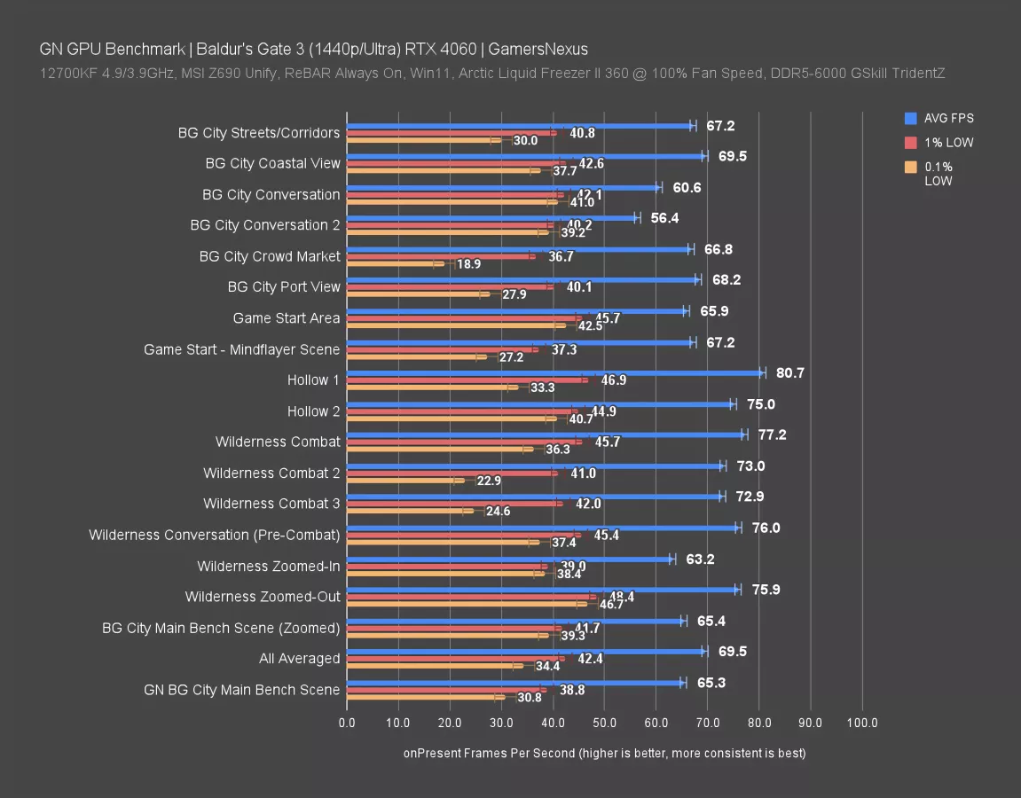 We tested in combat, in the forest, zooming in closer to characters, zooming all the way out. We tested conversations, and we tested in Baldur's Gate itself. The research took place on an RTX 4060 at 1440p Ultra, and we chose this card and these settings because we wanted something that was definitely GPU constrained but not so constrained that the data wouldn't really be differentiated.