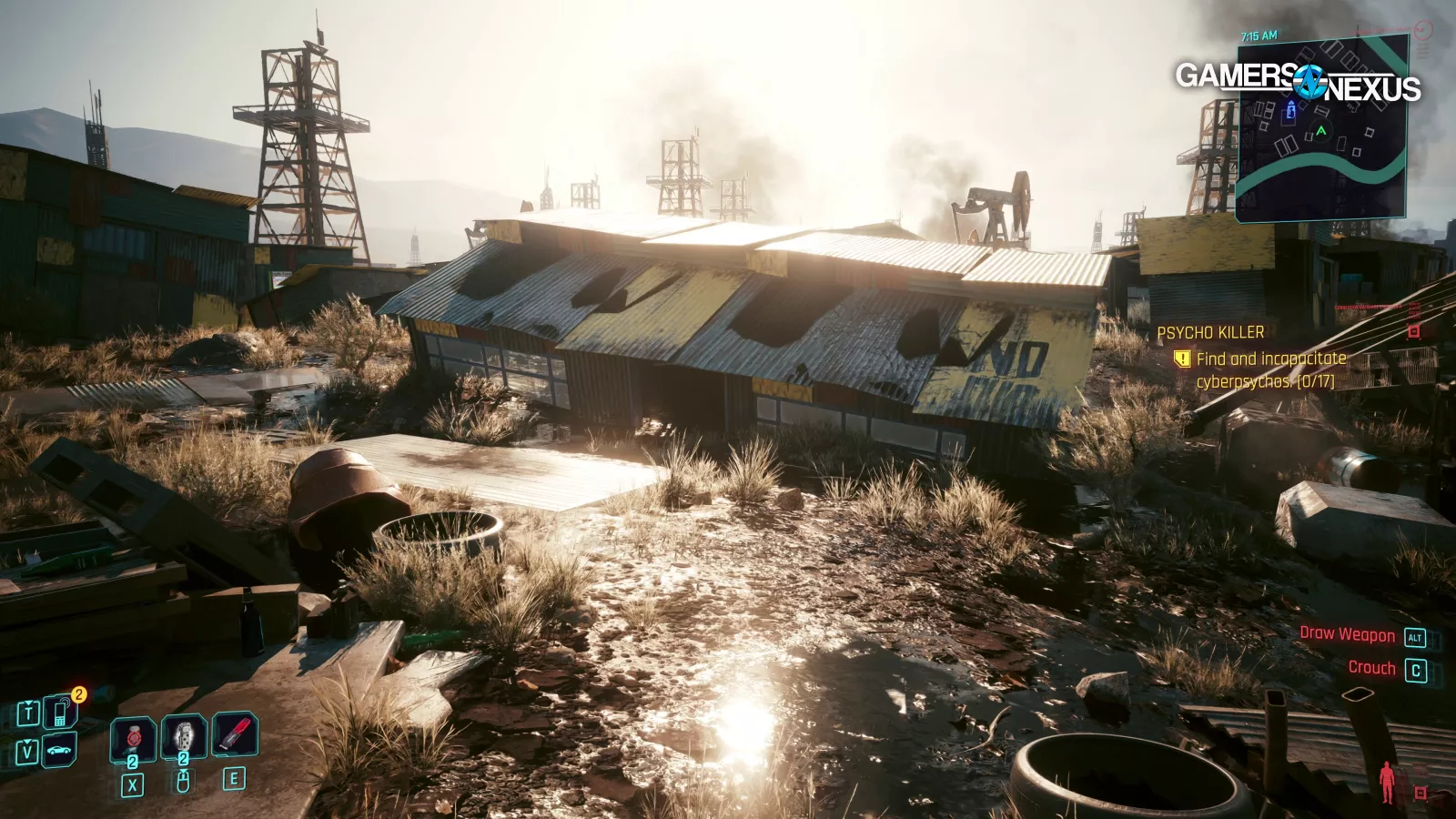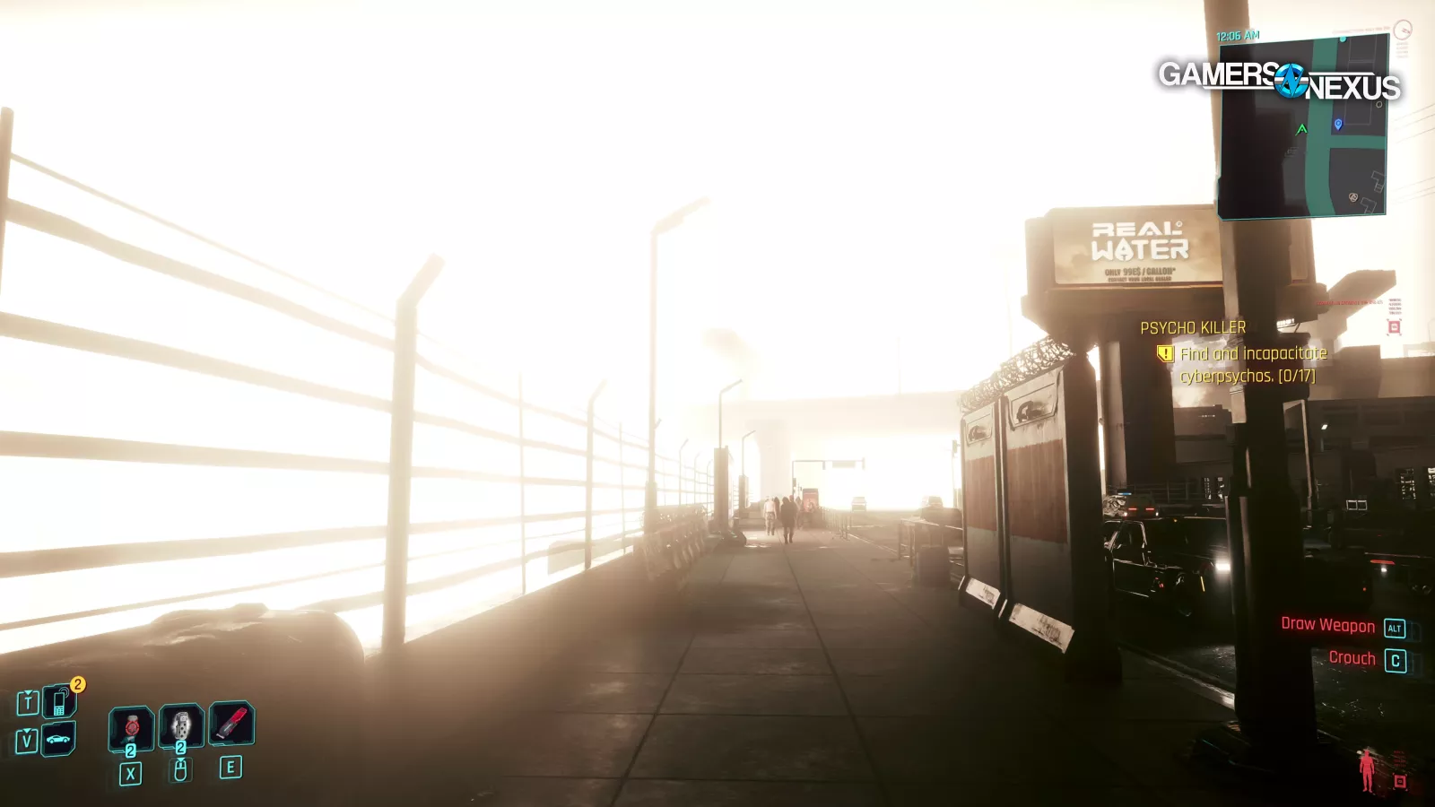We recorded passes of the baked-in benchmark for comparison, but we noticed that the smoke effects in the bar and alley varied heavily between scenes even with identical settings, so the majority of the benchmark is invalid for visual comparison. Instead, we'll skip ahead to the portions we can compare.