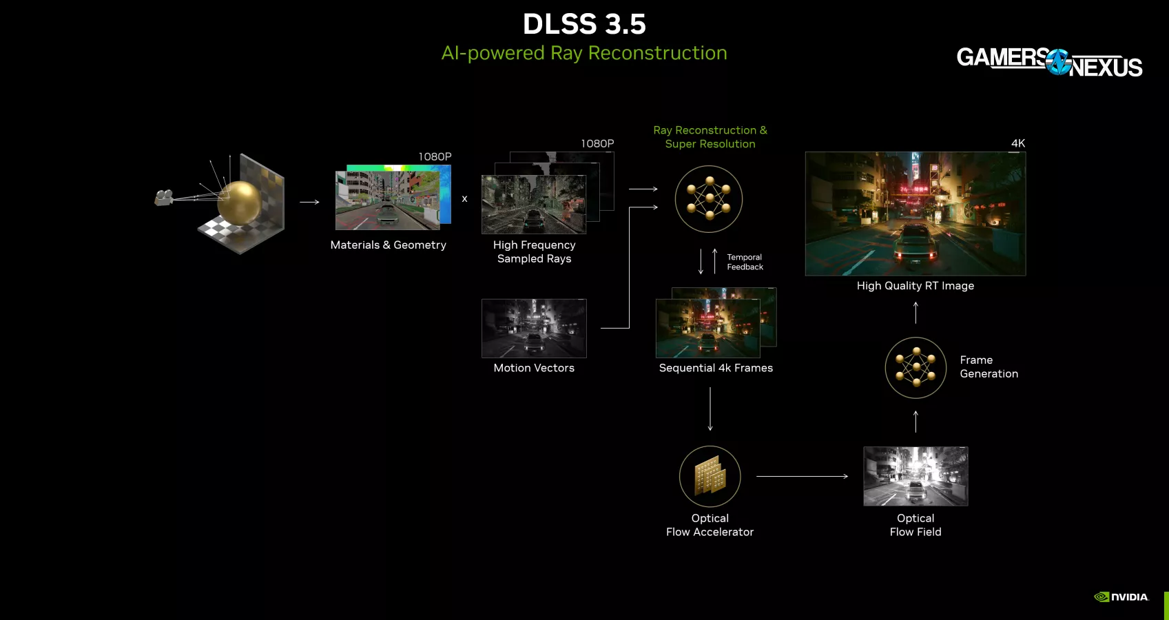 This is where ray reconstruction comes in. This is theoretically a no-downsides upgrade that fully replaces existing denoisers with "an NVIDIA supercomputer-trained AI network." If that sounds like an extension of DLSS upscaling, that's because it is: NVIDIA told us that "Ray Reconstruction is a combined AI model with Super Resolution." Taking ray samples and motion vectors as input, it intelligently predicts and outputs fully-lit frames as opposed to applying a blanket algorithm. According to NVIDIA, the model is being trained to "be able to handle all types of content" and doesn't require a return to game-specific training, although we at GN can only speak to Cyberpunk 2077 so far.