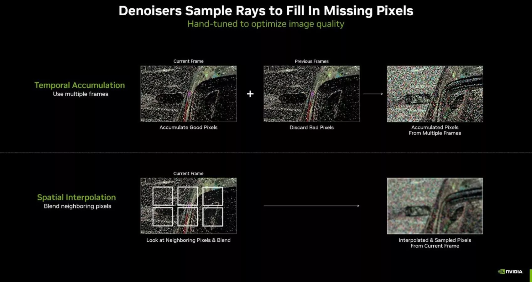 The gaps are filled in with denoisers, averaging data both spatially (between pixels in a single frame) and temporally (with pixels from past frames). If the denoising doesn't work well, either through a lack of samples or tuning, it can lead to sparkling, shimmering, or "boiling" effects. According to NVIDIA, denoisers are currently "manually-tuned and processed for each type of ray-traced lighting present in a scene."