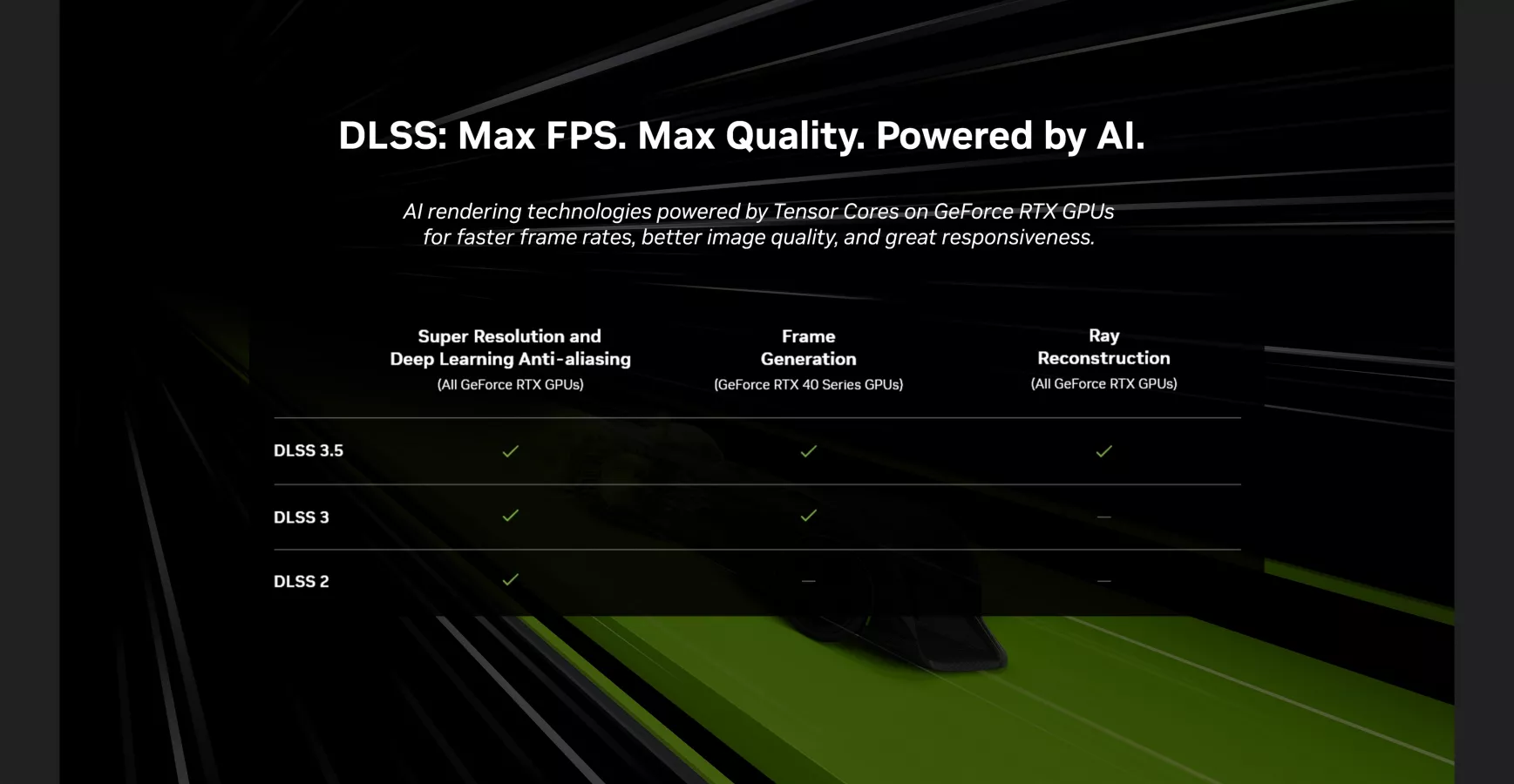 We'll start with an explainer: "DLSS 3.5" essentially means ray reconstruction. NVIDIA has a helpful table (above) for the different versions of DLSS and what cards they're supported on. For example, frame generation is supported on the RTX 40 series, all the way down to the RTX 4060, while ray reconstruction works on all RTX cards, including the RTX 3080 and older RTX 20-series GPUs.