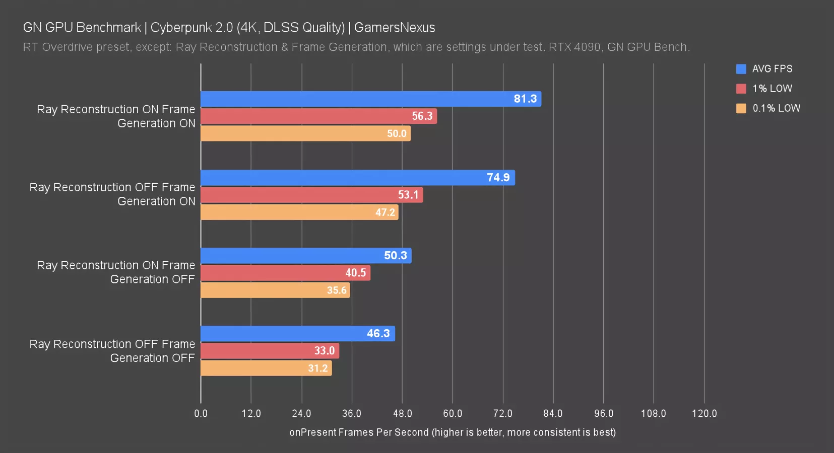 In this quick set of benchmarks, we have 4 entries. In the frame generation ON tests, we see ray reconstruction technically had an uplift for performance. There’s a reason for this—we’ll get to it.