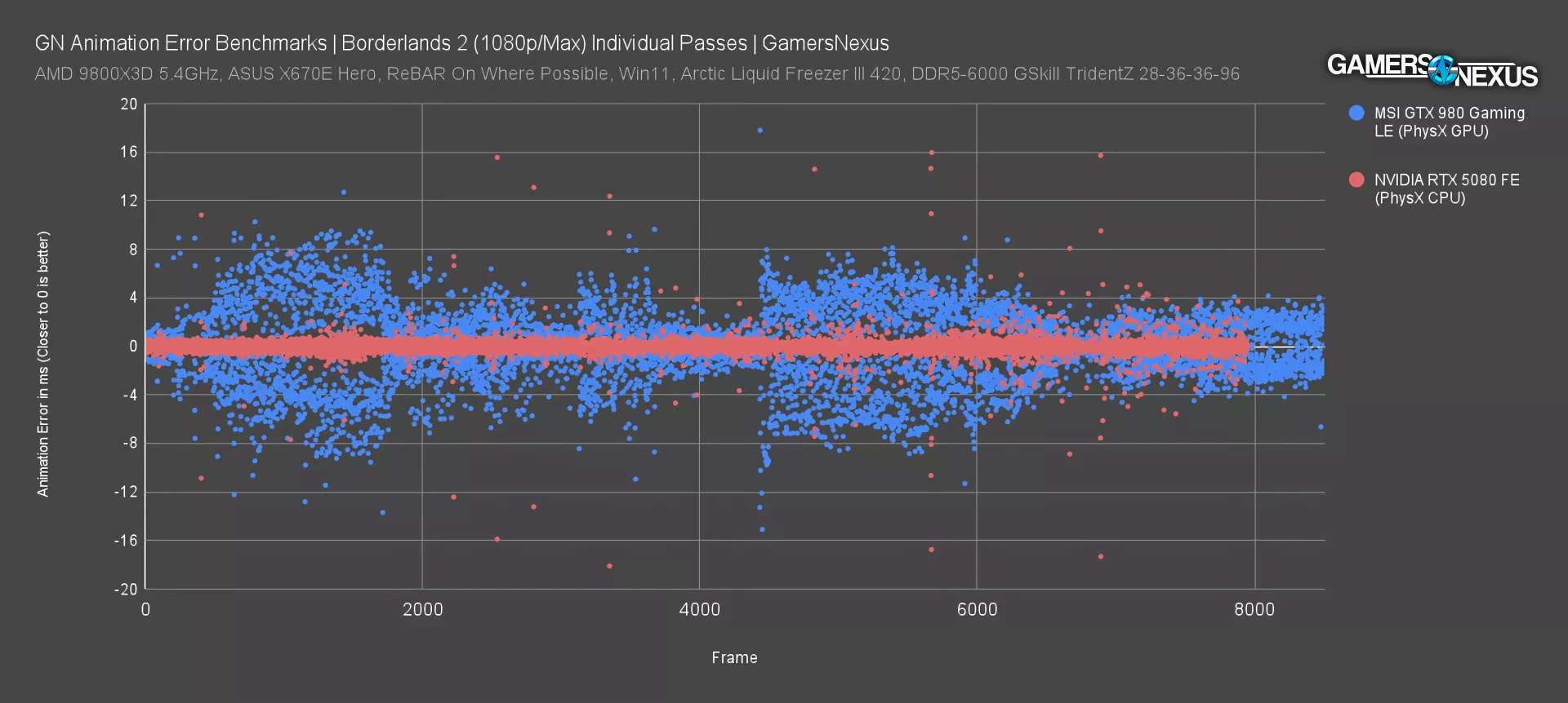 In spite of that, there's a clear difference in behavior, and animation error is much higher with the GTX 980. Using the percentage math we mentioned earlier, that's an error-to-frametime ratio of 11.9% for the 980 and 1.8% for the 5080, which allows us to identify a problem without having to generate frametime plots for every single result.