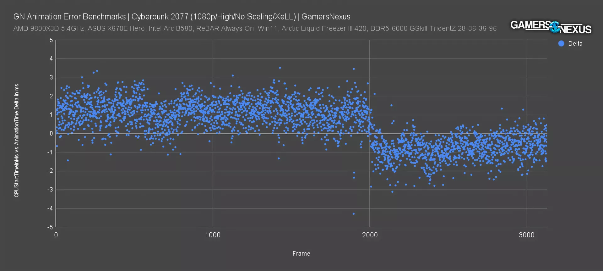 Here we have a PresentMon capture of Cyberpunk 2077. The X-axis shows individual, logged frames, and the Y-axis is the delta between CPUStartTimeInMs and AnimationTime for each frame. Normally, this would result in a perfectly flat line at zero, but since we have XeLL enabled, AnimationTime is based on SimStart instead. With XeLL there's a significant delta between the two values on nearly every frame, which shows that AnimationError would be incorrect if it were based on CPUStartTimeInMs when low-latency modes like XeLL, Reflex, and Anti-Lag 2 are enabled. AMD's Anti-Lag 2 doesn't generate SimStart events that PresentMon can grab, so (for now) we won't be able to accurately score AnimationError with that feature enabled.
