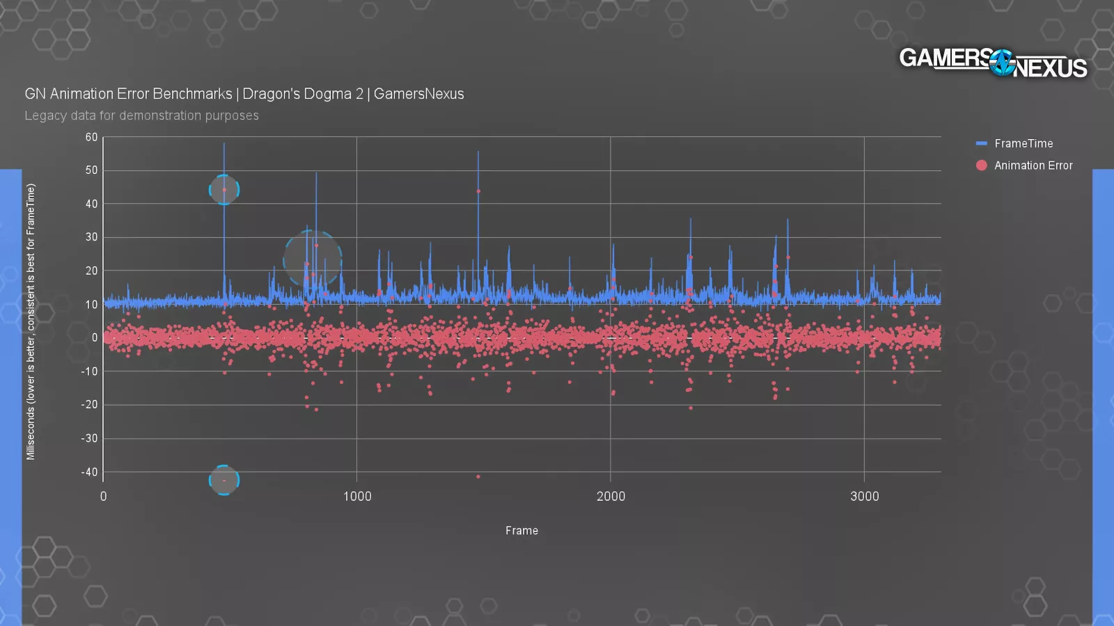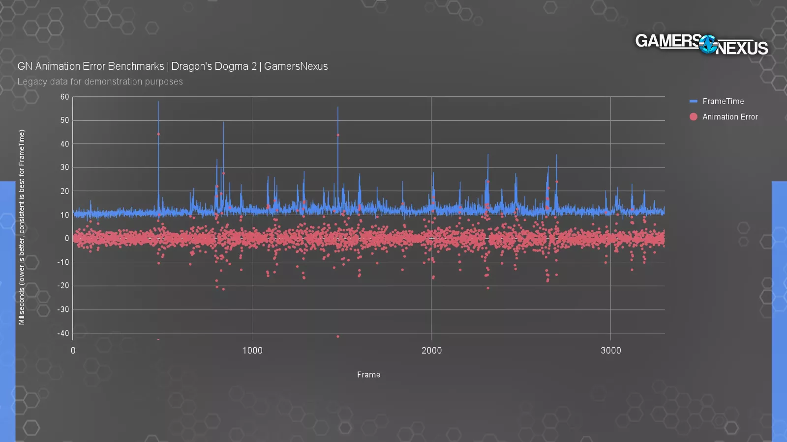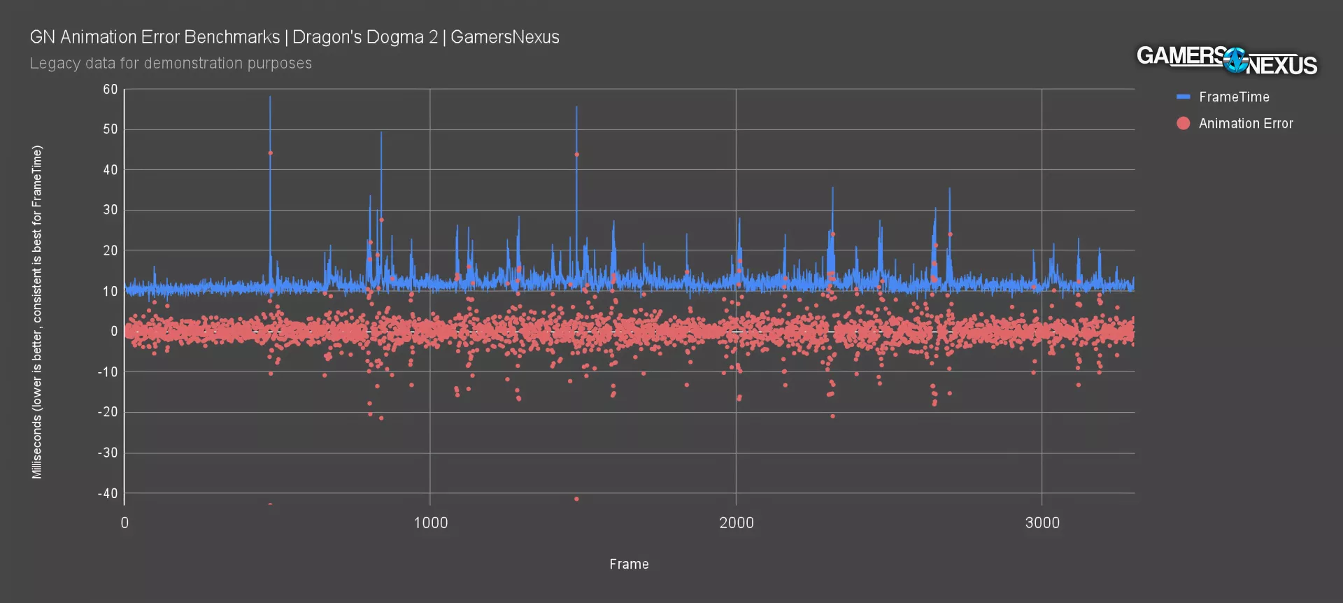 This chart is from our Dragon’s Dogma 2 testing at launch, where we were quietly beginning to farm data for this eventual piece. You can see where the animation error blips often align with the frametime spikes, but not always.