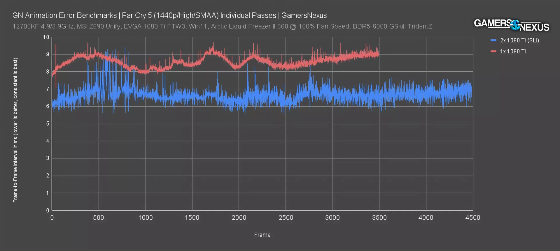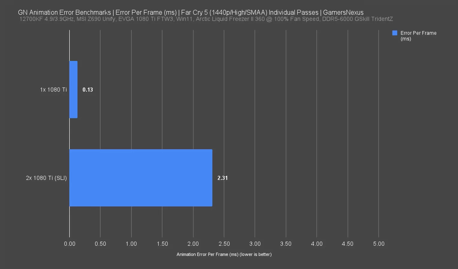 This is an “Error Per Frame” chart we attempted, which puts the data back into bars for denser comparison of more cards. Maybe this could work better as a visualization: for those two individual passes in Far Cry from earlier, the total animation error (taken as absolute values) divided by the total number of frames was 0.13ms per frame for the single 1080 Ti and 2.31ms per frame for the SLI 1080 Tis. These are basically single-number summaries for the plots we just showed. But now we’re doing the bad thing again: We’re abstracting away from the base metric over time (shown as frames) and converting it into a bar, because that’s easier to read. This isn’t ideal for a lot of reasons.