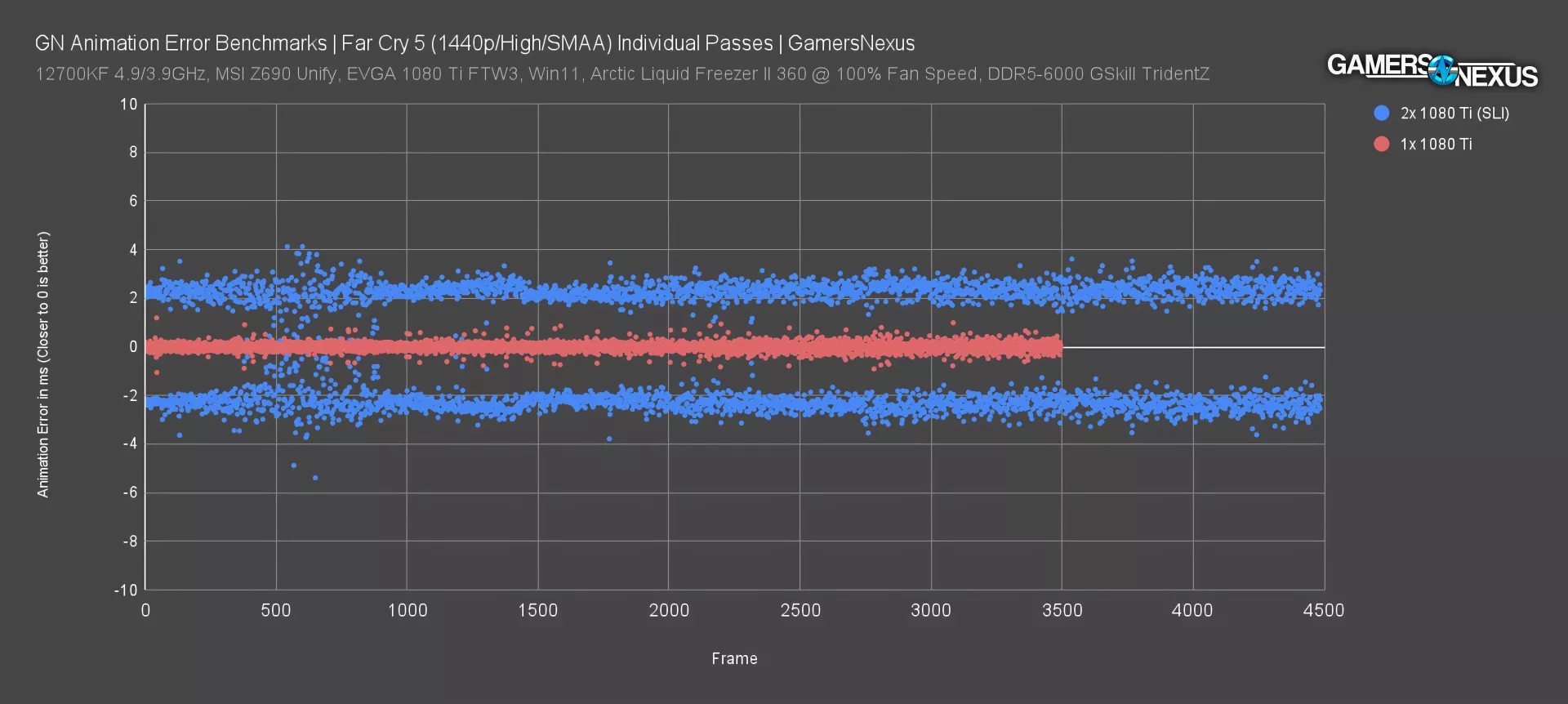 The main advantage of a plot like this is that we don't have to insert our own calculations or conclusions: we can simply show the data. The single 1080 Ti sticks even closer to zero animation error per frame than it did in Far Cry, while the SLI 1080 Tis continue to generate 2-3ms of positive or negative error on nearly every frame, only rarely approaching zero.