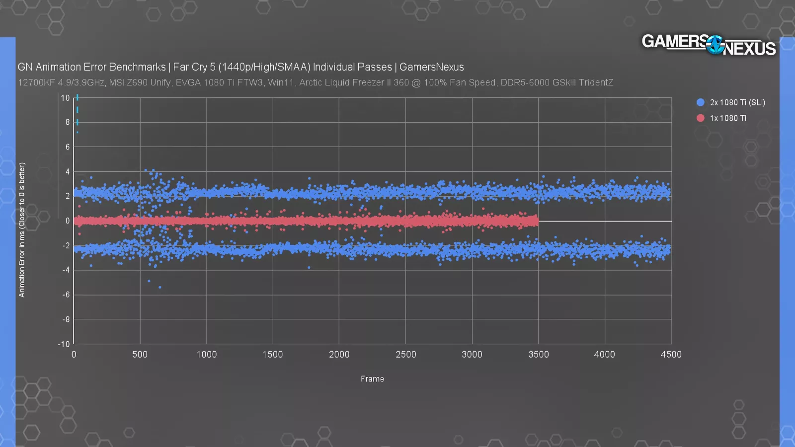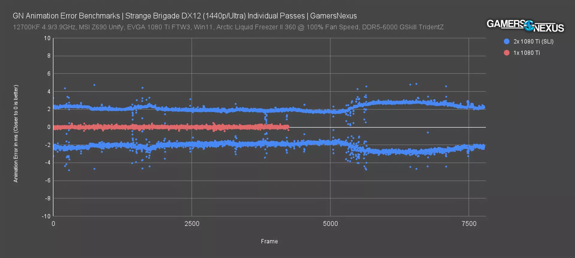 First of all, this could obscure individual big error spikes (if that's something we want to track), and secondly, it also adds framerate back in as a variable. The SLI setup generates more frames, which lowers the end result for this calculation, arguably making the SLI cards look unfairly good; then again, maybe it’s not “unfairly” because more frames going by quicker could help disguise animation error.