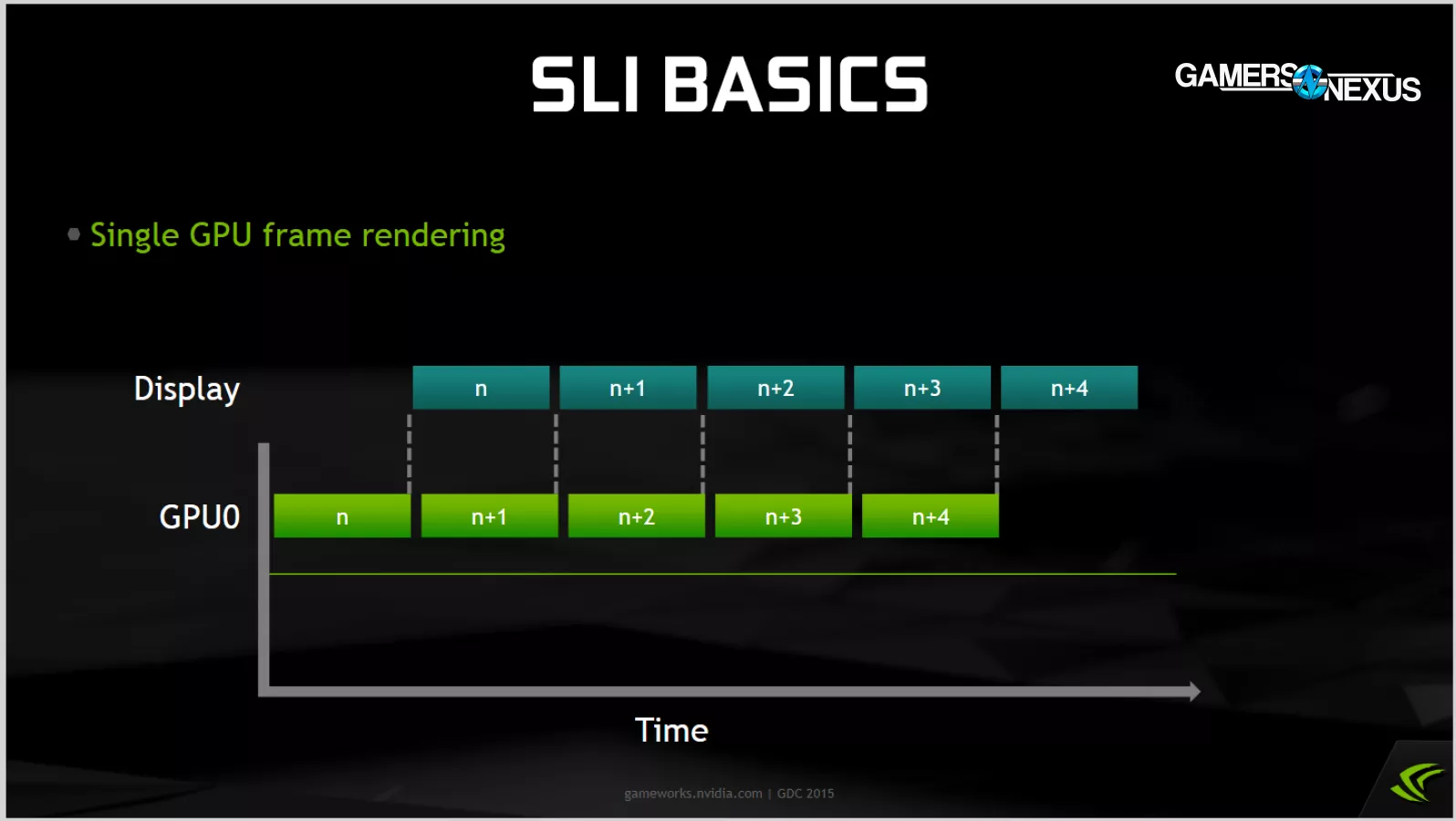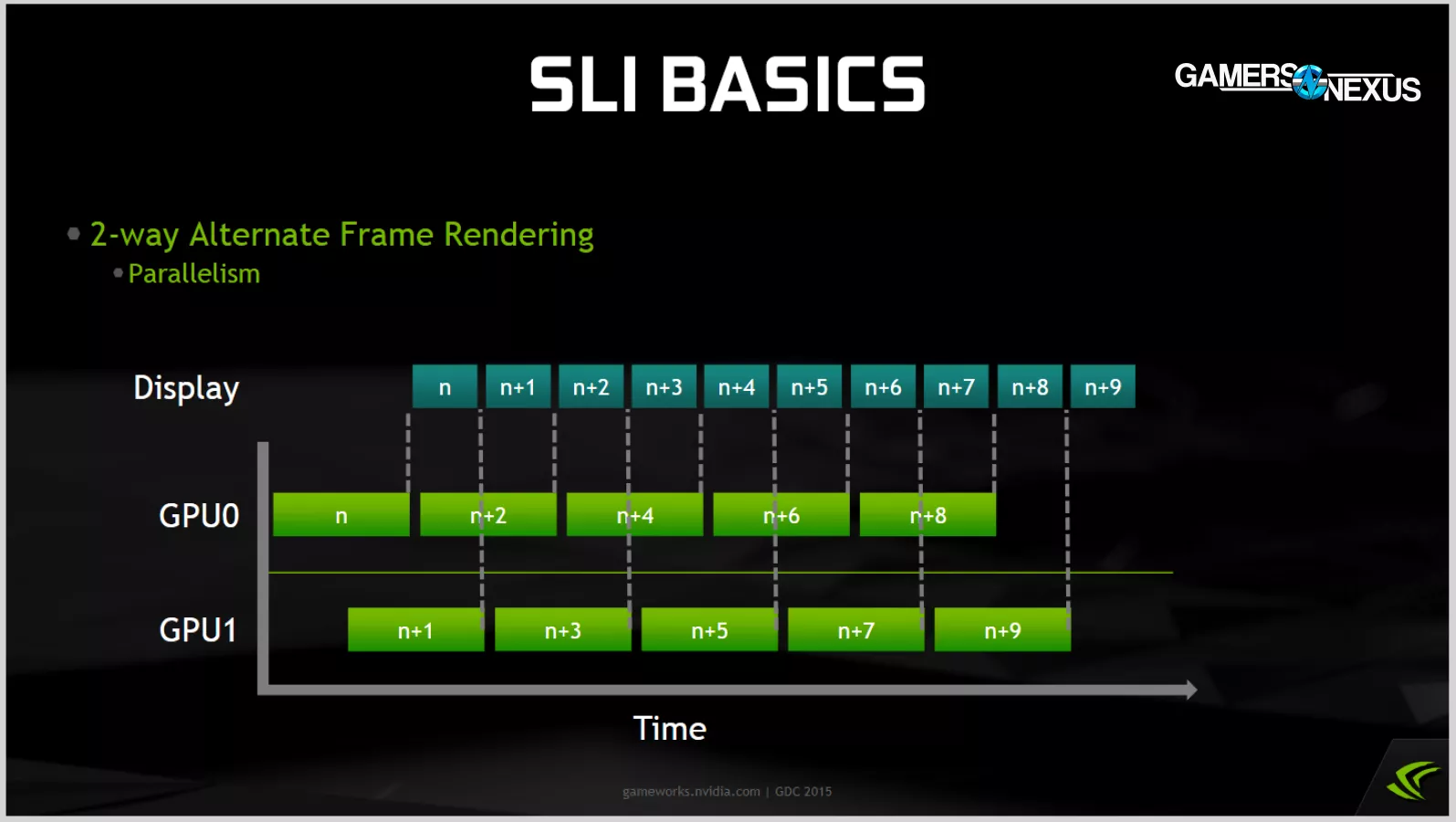 One of the major difficulties with AFR is trying to synchronize GPUs. Here, GPU0 and GPU1 are taking the same amount of time to complete individual frames, but they're poorly synced so that some frames get little display time and are effectively wasted.