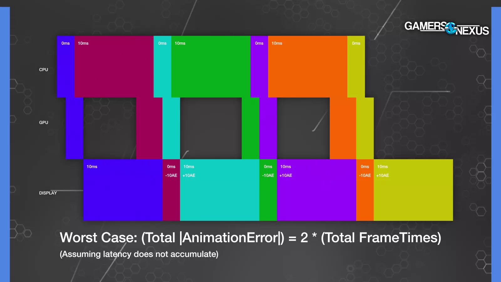 THIS diagram makes that abundantly clear by showing that alternating between infinitely small frametimes rounded to zero and 10ms frametimes, and inversing the display times, we can get 10ms or -10ms of animation error per frame, where adding up all frametimes gives us 30ms yet adding up absolute values of the animation error gives us 60ms.