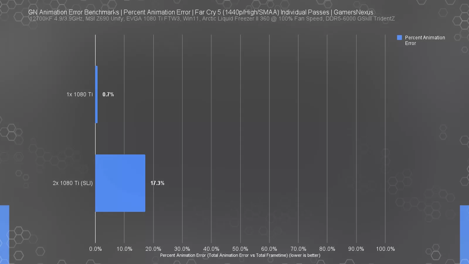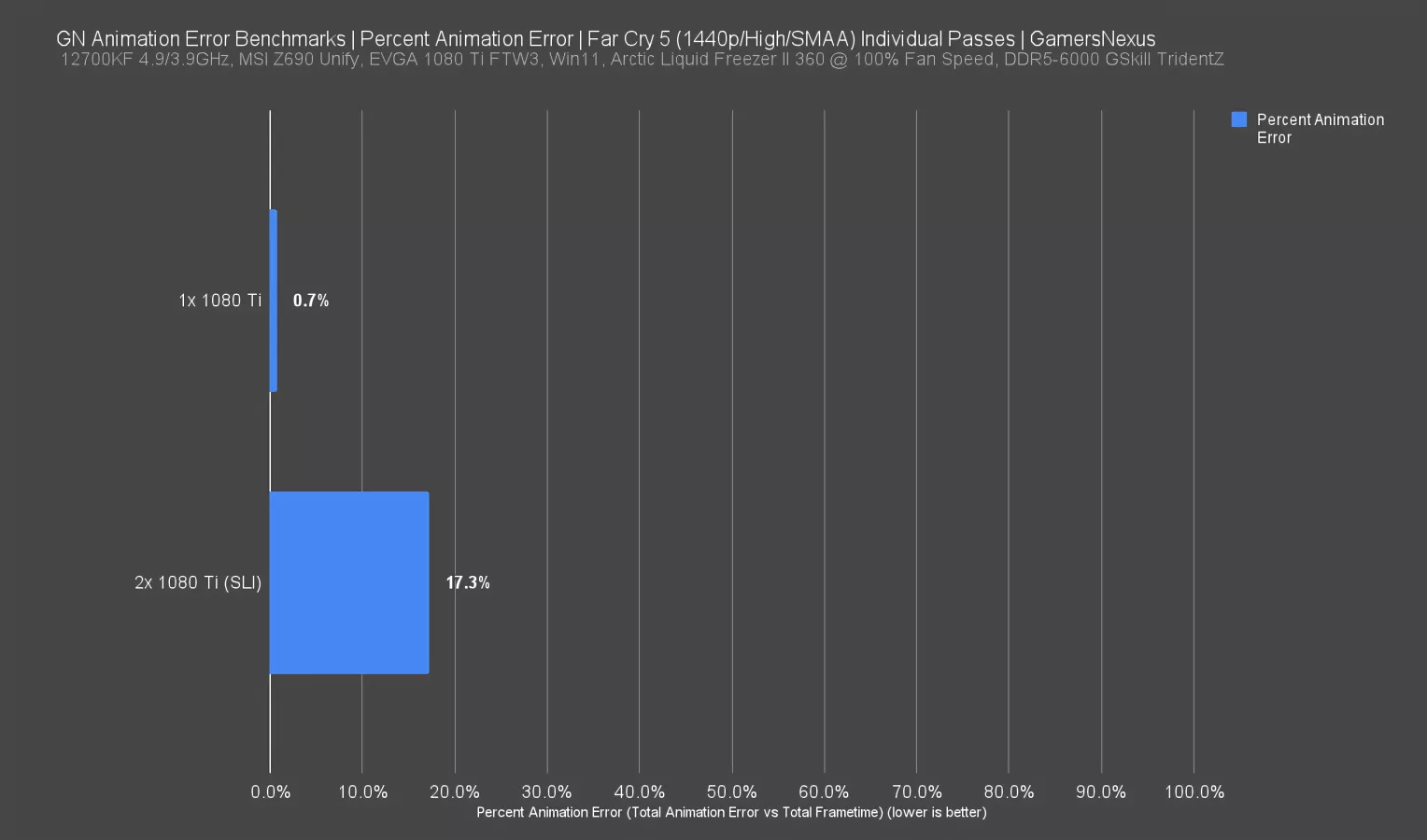 We used the same two Far Cry passes for this example: for the single 1080 Ti, the result is 0.7%, and for the SLI setup the result is 17.3%. This potentially cancels out or reverses the high-framerate advantage from the last chart: more frames equals more (total) error.