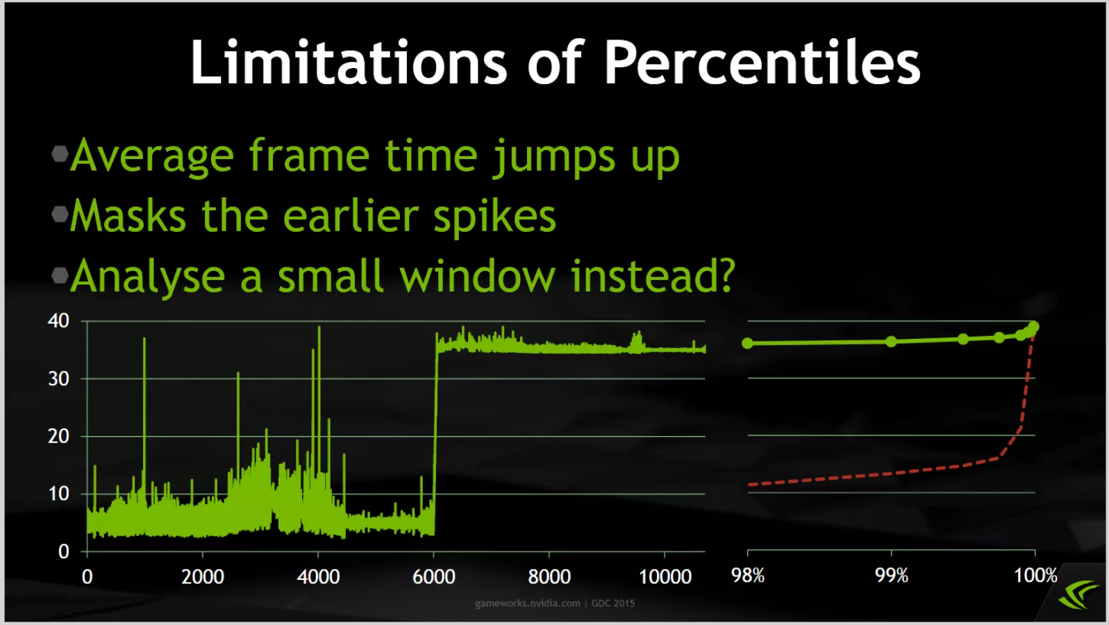 We probably wouldn't use a test scene that resulted in a graph like the GDC 2015 one shown above by NVIDIA, but as it points out, there are scenarios like this where frametime spikes could be artificially masked and not show up in 1% and 0.1% low calculations.