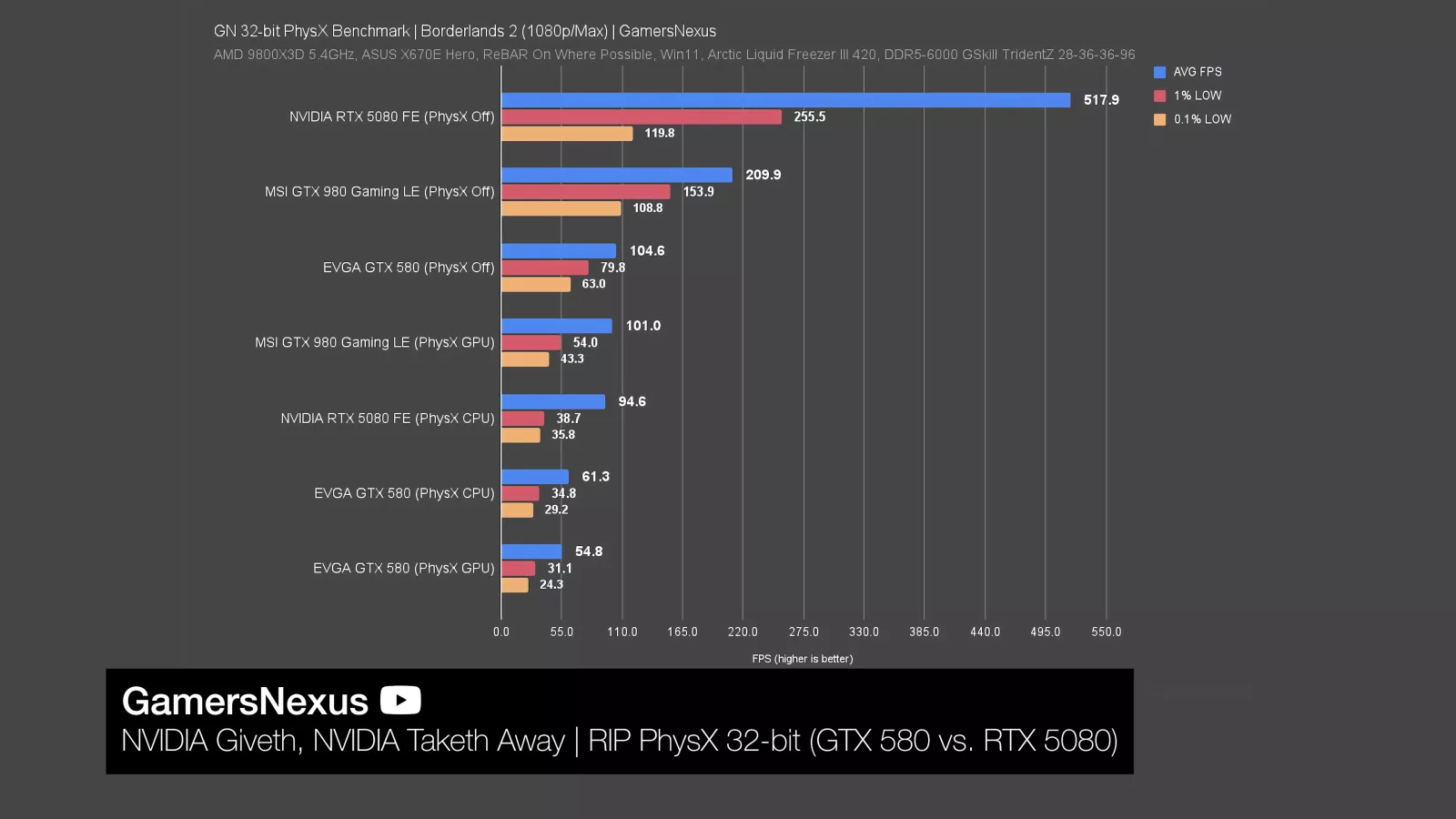 These two results are from our piece about the death of 32-bit PhysX. These two particular results were fairly close together both in terms of average FPS and lows: the GTX 980 with GPU PhysX averaged 101 FPS across multiple passes and the RTX 5080 (read our review) with CPU PhysX averaged 95 FPS. These are real results and we explained them in our piece about NVIDIA killing 32-bit PhysX support this year.