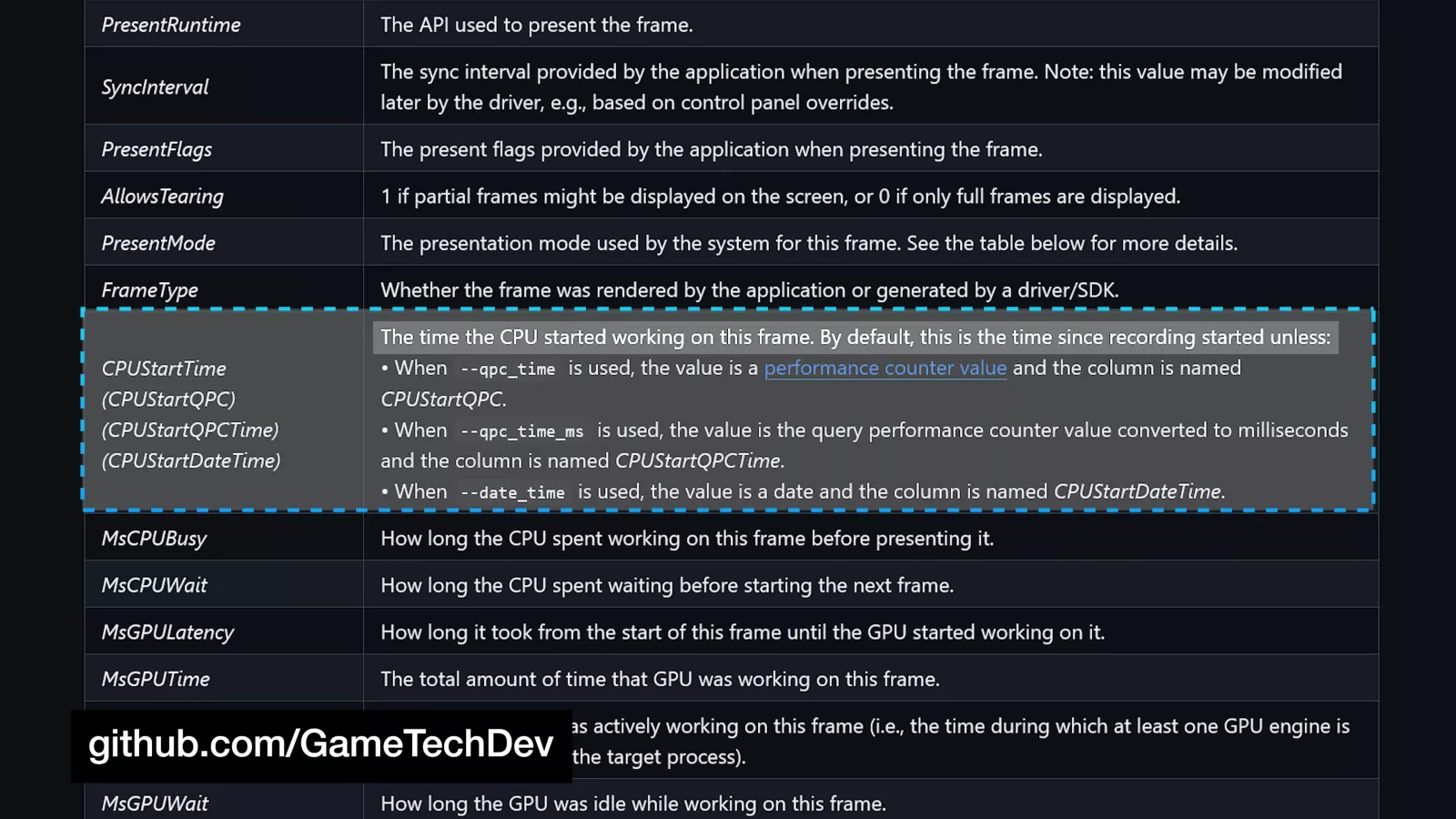MsGPULatency: The period between the absolute start of work on the frame (CPUStartTimeInMs) and the point at which the GPU started working on it. The start of the GPU render period can be inferred from this.