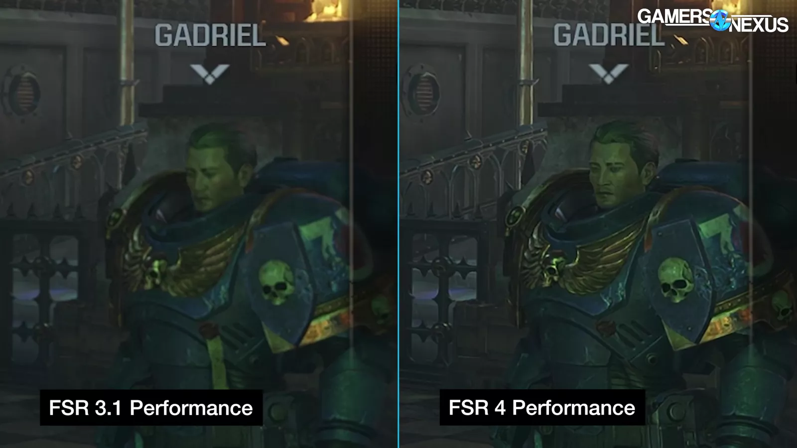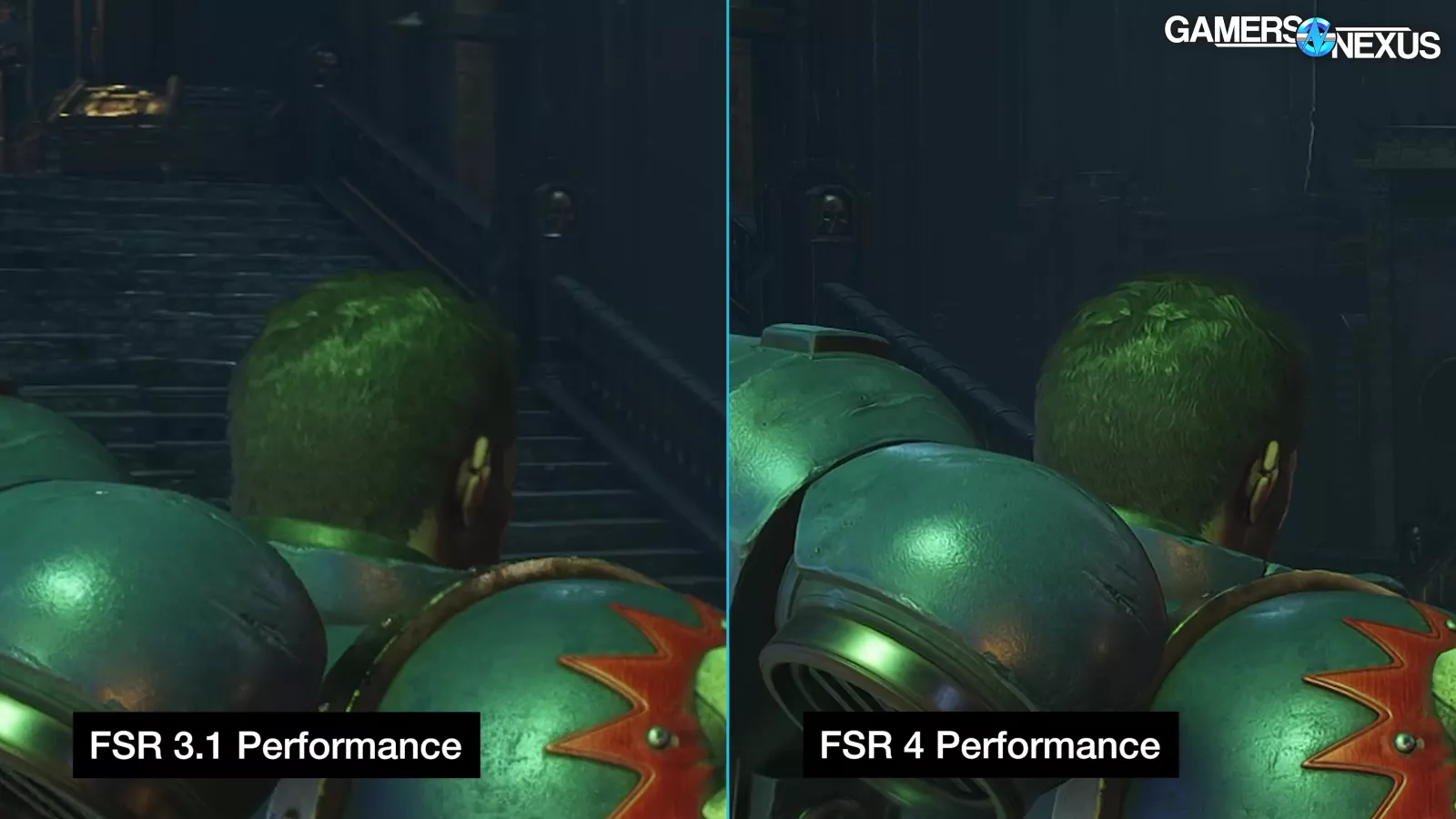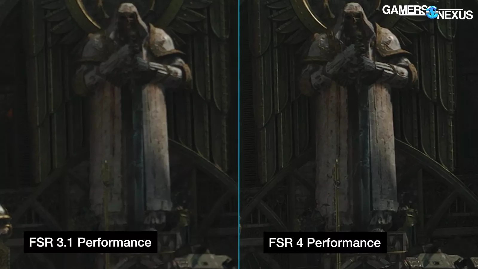 We’ll start the comparisons with a scene in the Armory, or “Armouring Hall” in native Grimdark. Even before walking forward, the difference between FSR 3.1 and FSR 4 is stark. Static elements like the floor of the walkway that shift and shimmer heavily with FSR 3.1 are now stably locked-in. On top of that, the entire image is much clearer and more detailed.