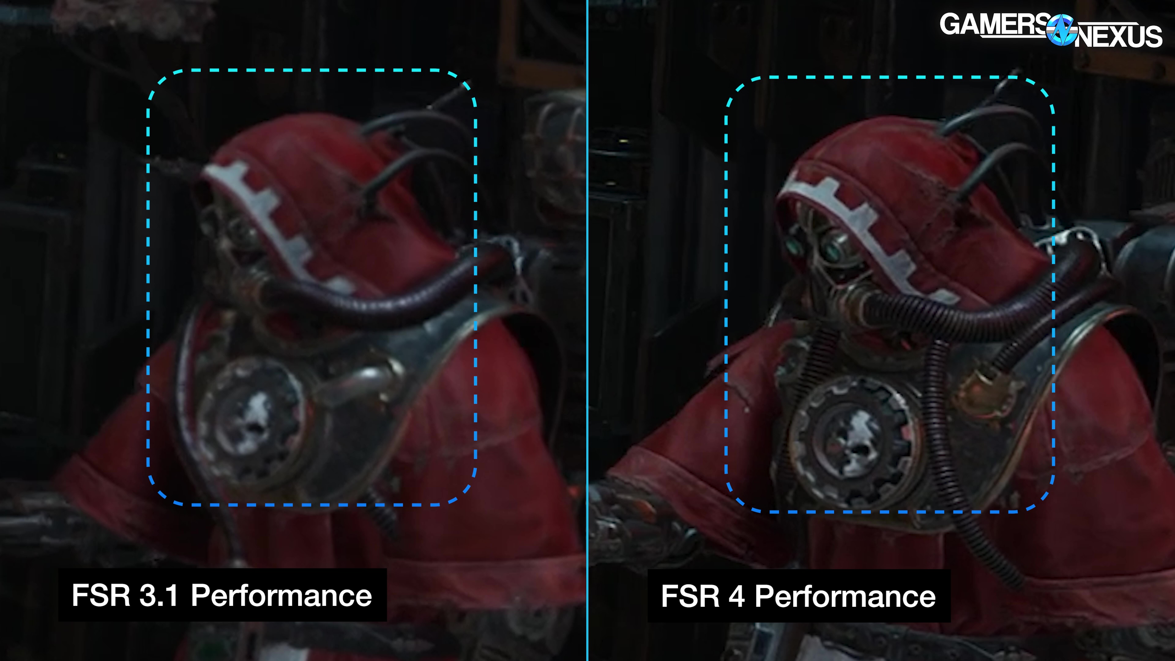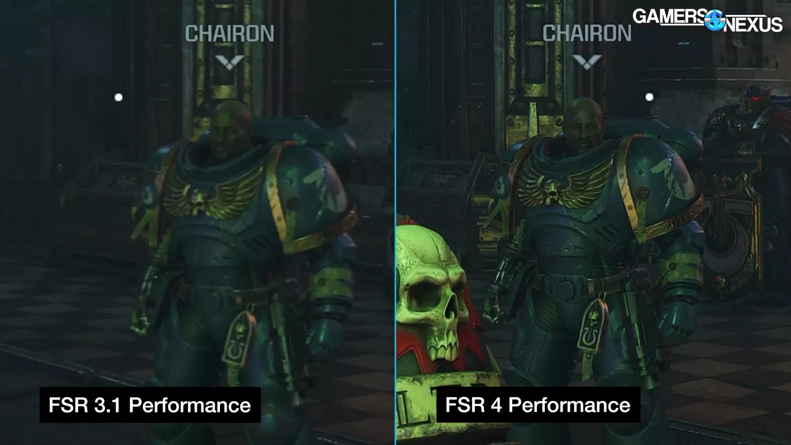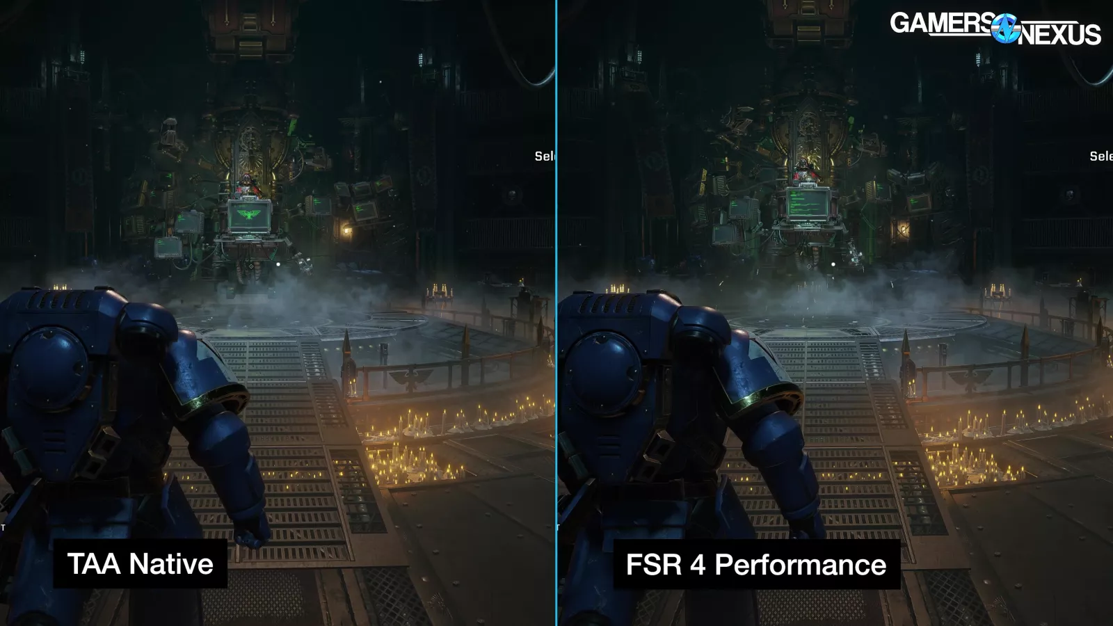 We’ll start the comparisons with a scene in the Armory, or “Armouring Hall” in native Grimdark. Even before walking forward, the difference between FSR 3.1 and FSR 4 is stark. Static elements like the floor of the walkway that shift and shimmer heavily with FSR 3.1 are now stably locked-in. On top of that, the entire image is much clearer and more detailed.