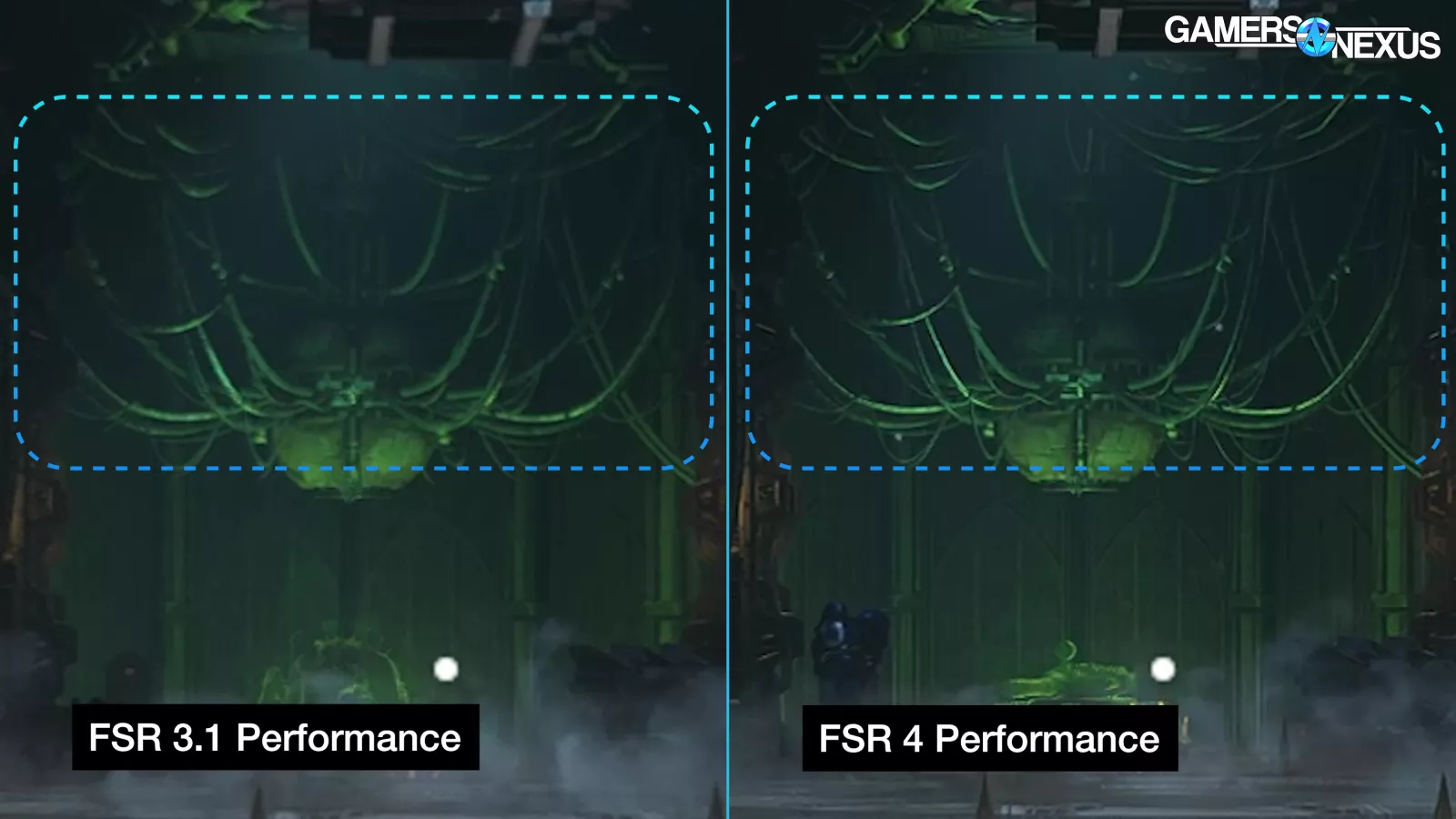 Last for Space Marine 2 is an upscaling torture test by way of a slow pan of the Tyrranid assault. The flying creatures passing over the front of the massive building cause the windows to warp and blur heavily when using FSR 3.1. It still happens with FSR 4, but to a lesser extent. This is close to a worst case scenario for any upscaler, period.