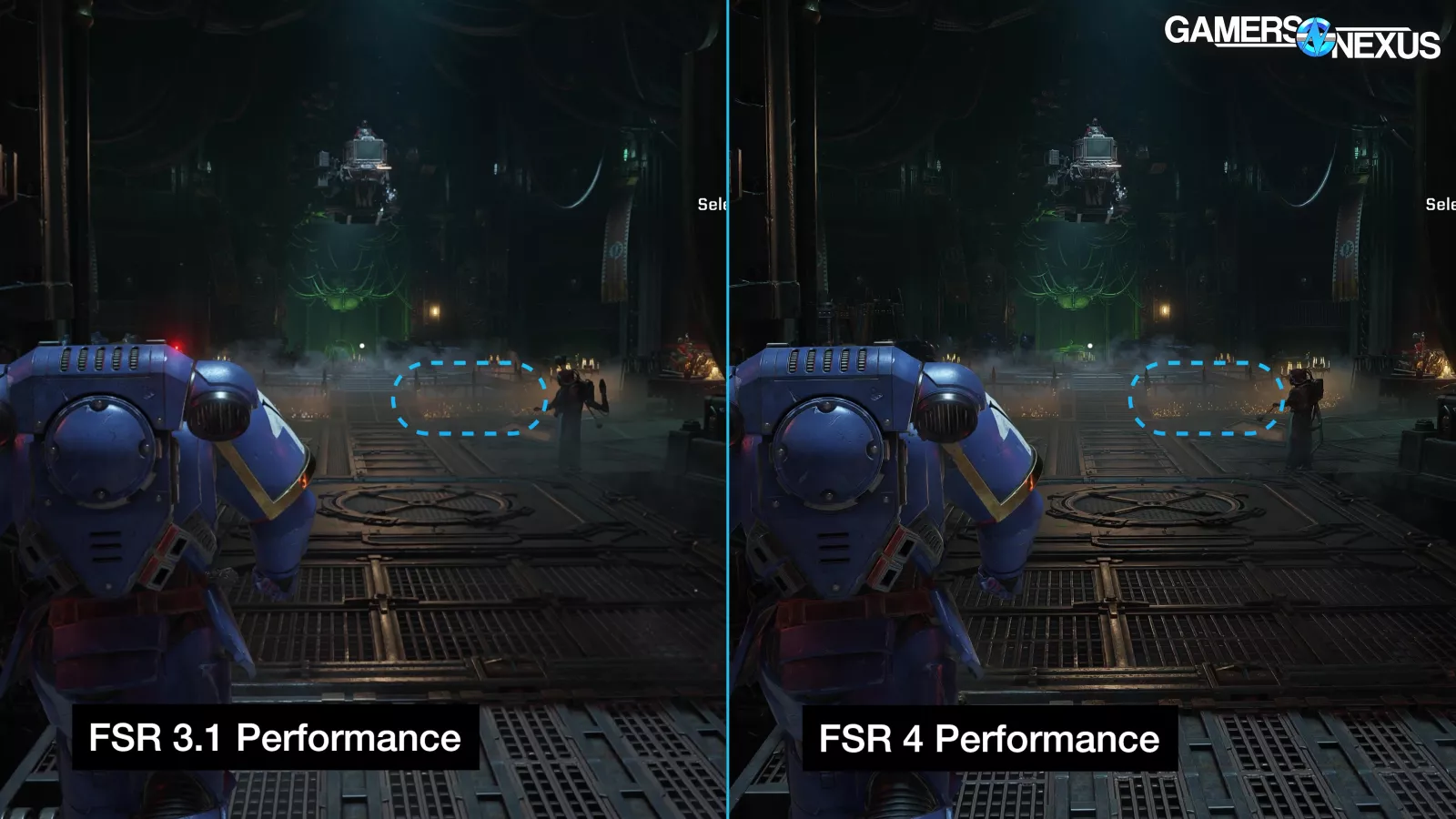 Examples of this include the floor, where we see improved image stability and clarity, the Ultramarine’s armor showing similar improvements in a side-by-side, the distant hanging cables, and the tech priests’ hoods. Distant candle flames that can’t even be made out with FSR 3.1 are visible with FSR 4, bringing them back into existence.