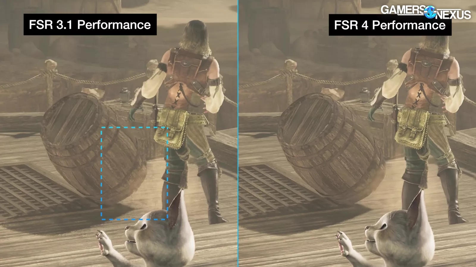 One clear difference is in trails behind objects moving across a patterned background. For example, when the two Felynes drop the barrel, it leaves a smeared trail behind it on the wooden walkway, as does the NPC on the left side of the screen and the unfortunate Felyne as it falls backwards. We think FSR 3.1 handles this very poorly – FSR 4, while not perfect, definitely does better.