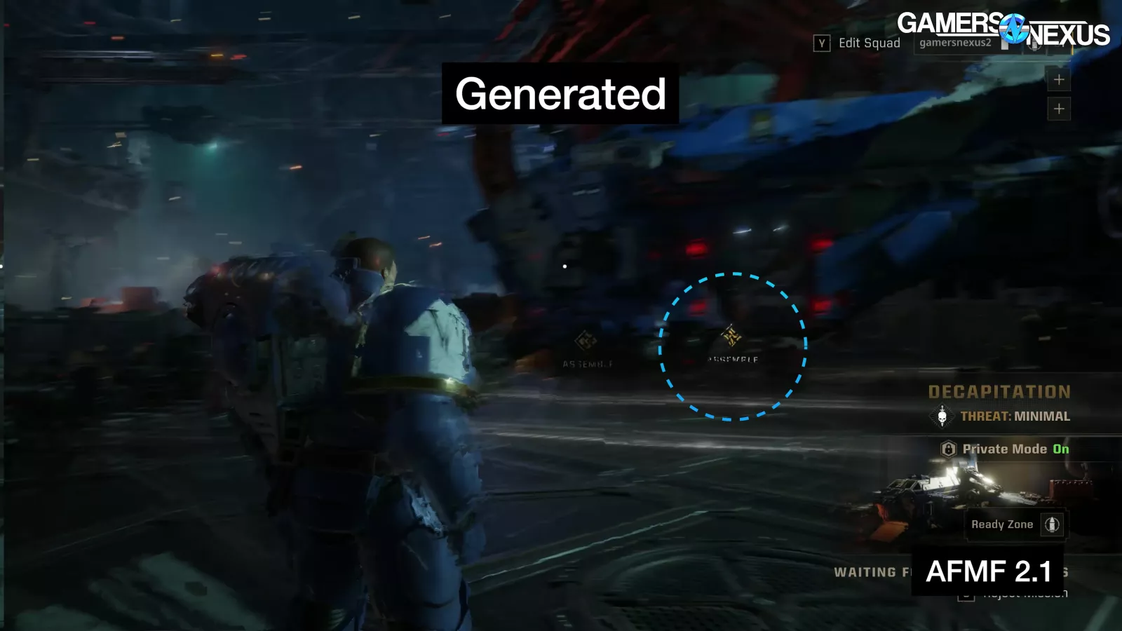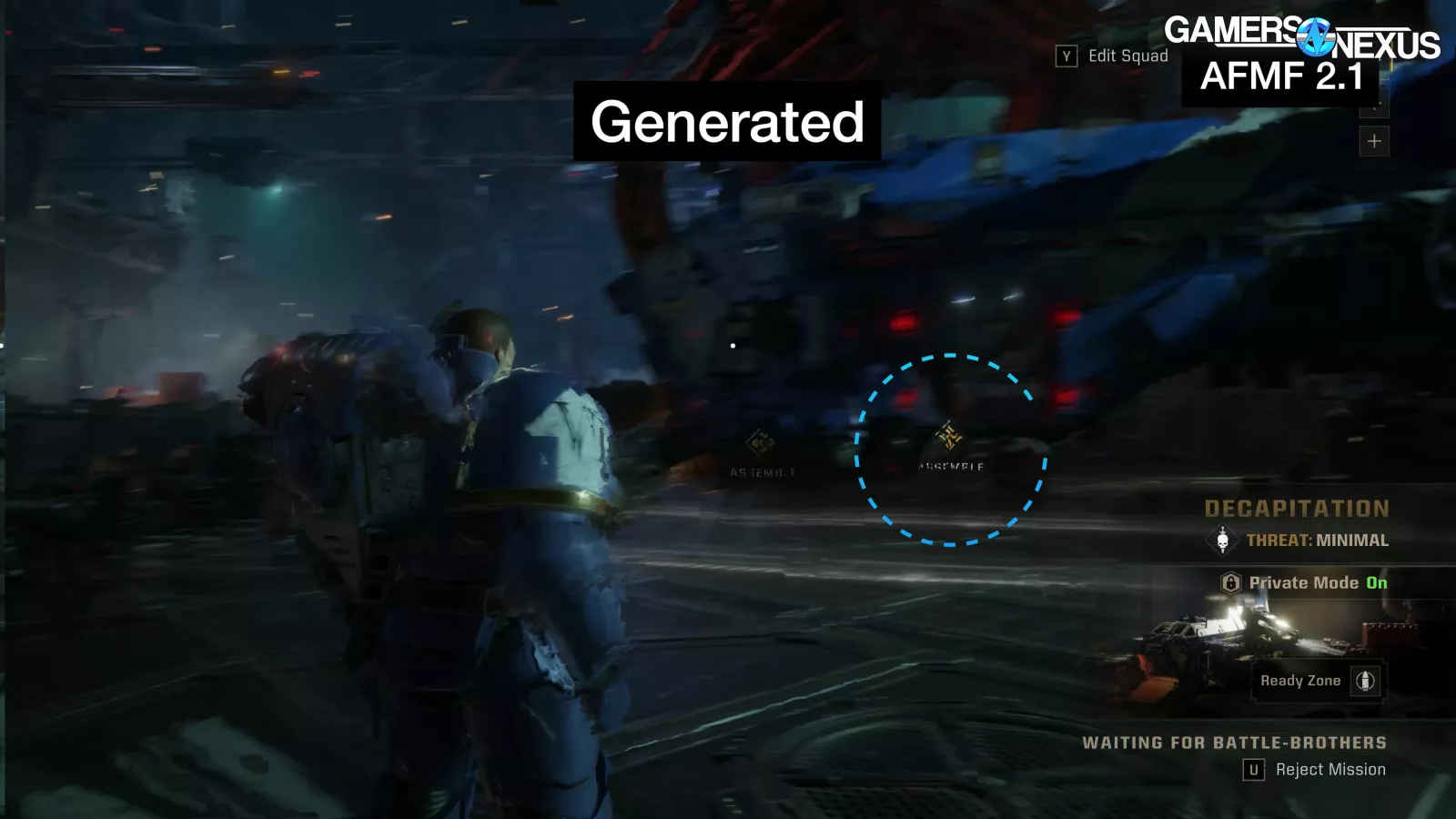 We recorded an additional scene in Space Marine 2 to show the downsides of frame generation. These clips aren't tightly controlled or synchronized; we just loaded into the main hub and shook the mouse around violently, so we’ll freeze frame some parts to show the issues. Besides making it very obvious that motion blur was still on (despite being toggled off), this allows us to see multiple frames where AFMF is definitely applied on top of UI elements like the "Assemble" waypoint. Applying frame generation on top of UI elements can cause ghosting and duplication of UI elements, which just looks bad. We can compare this to the in-game frame generation option, which is also a garbled, muddy mess in this scenario, with distortions around the edges that almost look like eye floaters. It completely breaks in this scenario, but perfectly preserves the UI layer even in the worst frames.