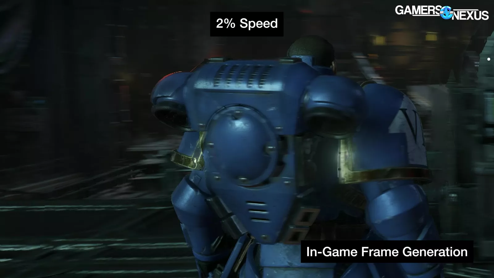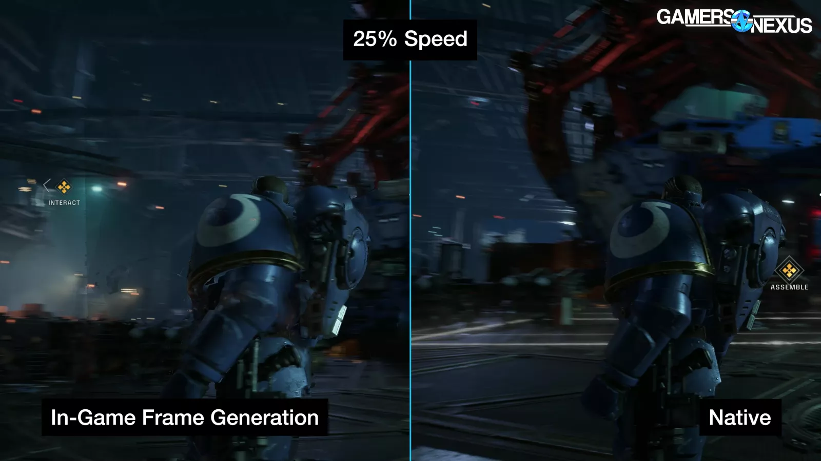 Our armory scene is relatively slow, but we can still see the effects of frame generation on moving limbs versus native rendering. The telltale sign of generated frames here is the slight blurring of detail on the marine's armor in frame-by-frame playback, like the back of his right leg as he passes under the light, but this is only really visible when closely examining individual frames in a specific location. The mandatory motion blur and application of FSR also help disguise the generated frames, since both of these effects lead to the same kind of temporal smearing that generated frames are subject to.