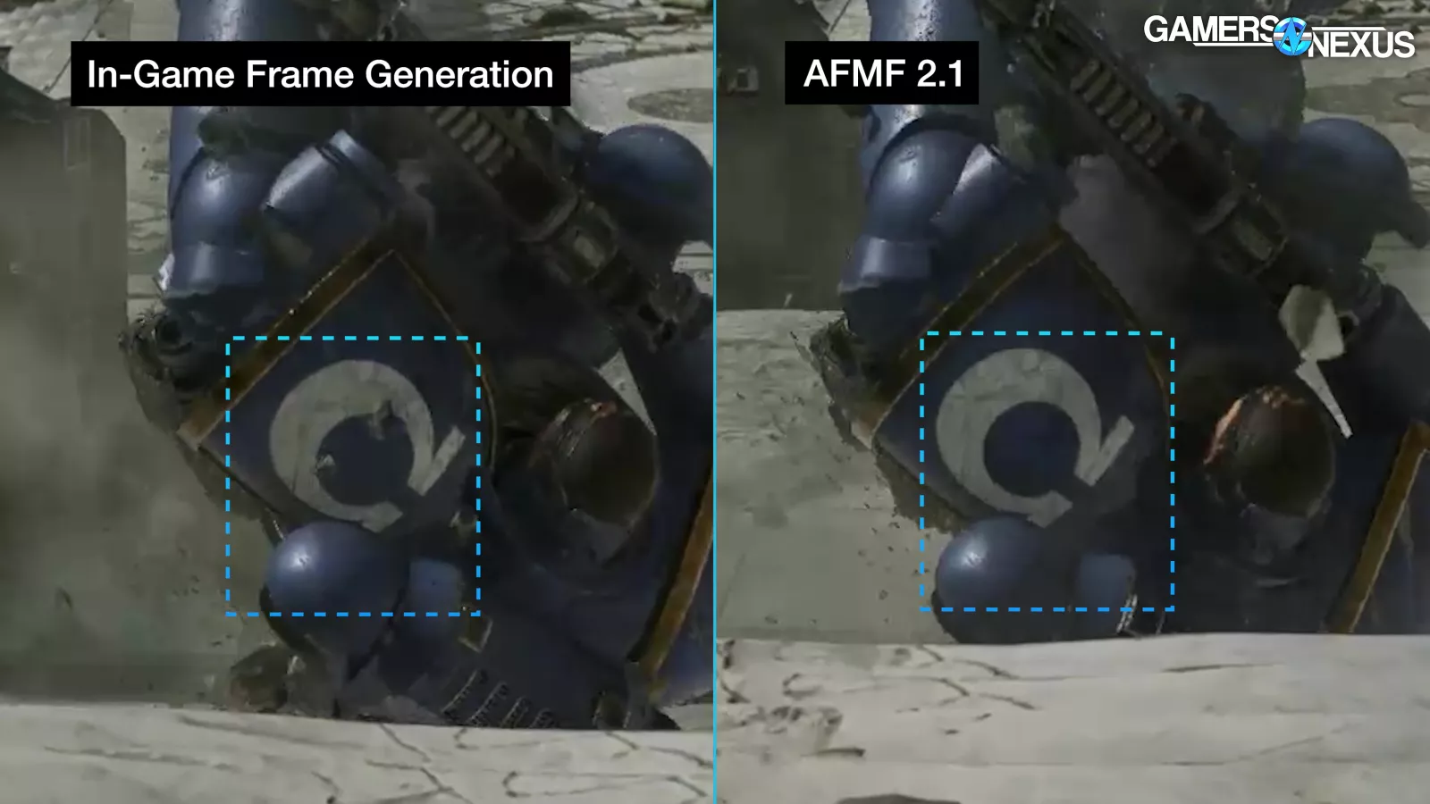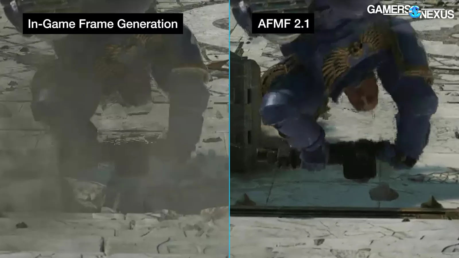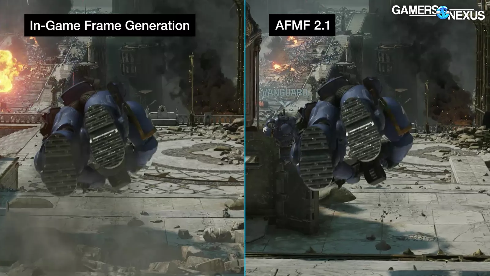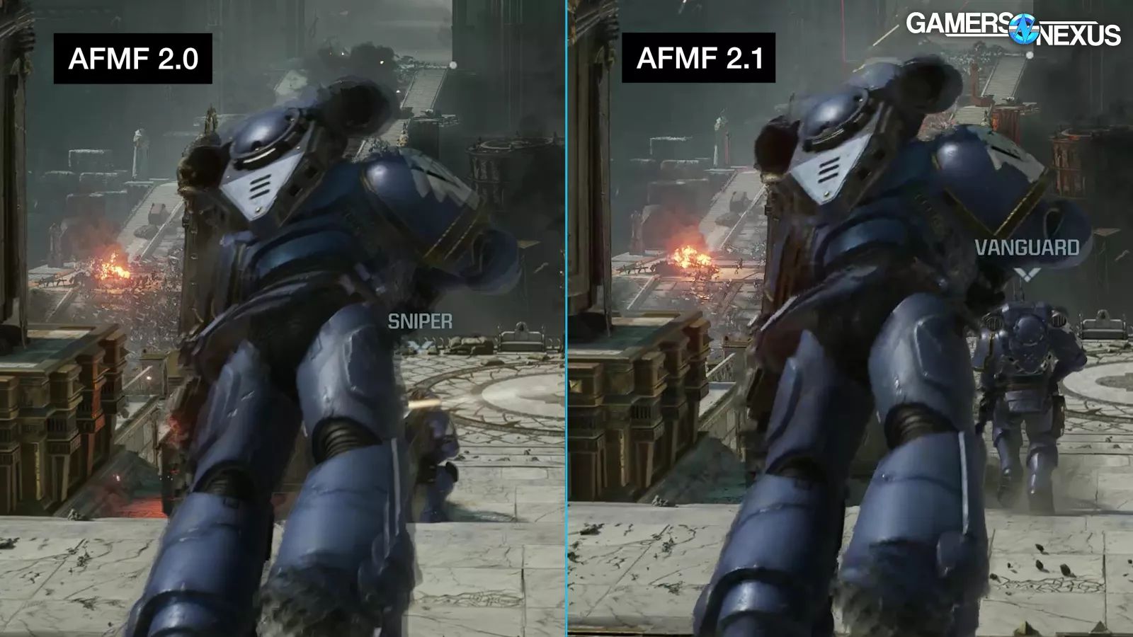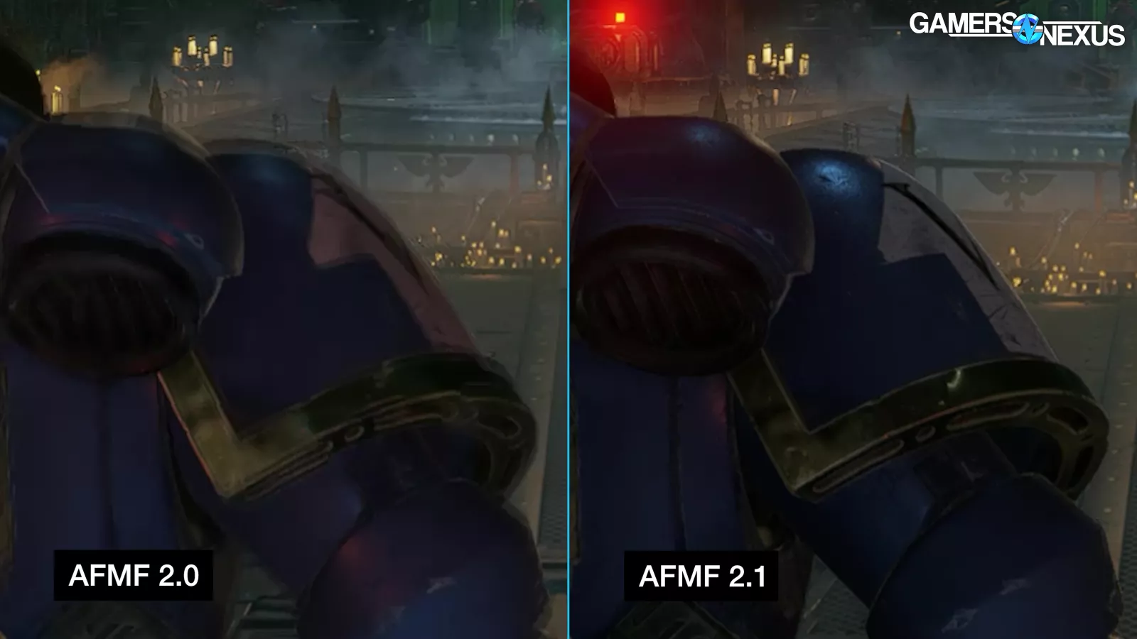 The frame-by-frame playback of AFMF 2.0 versus 2.1 reveals greater differences, with a prominent secondary image surrounding the marine's right arm in advance of its movement in the next "real" frame. This only affects moving elements of the scene; there's no noticeable sign of frame generation in the relatively static background even with the older version.