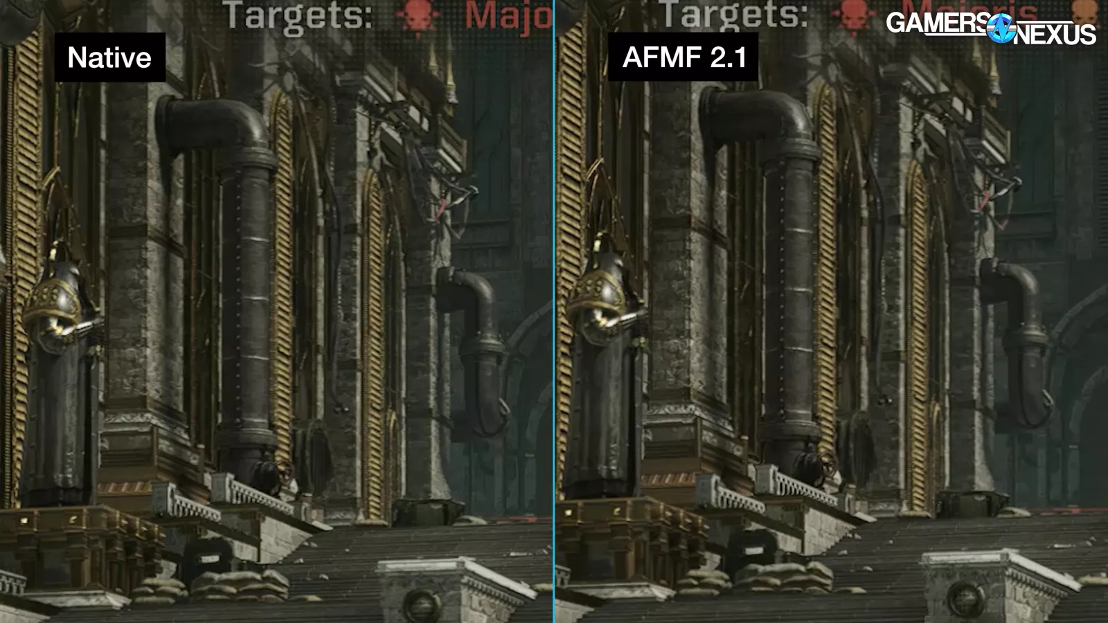 For comparison purposes, we selected games that support in-game frame generation to compare with driver-level changes. In the real world, you should almost always opt for in-game frame generation over AFMF at the driver if in-game is available. The most obvious downside of AFMF is that it has no awareness of UI elements, so menus, text, and icons may be distorted (although we saw NVIDIA struggle with this even with in-game frame generation).