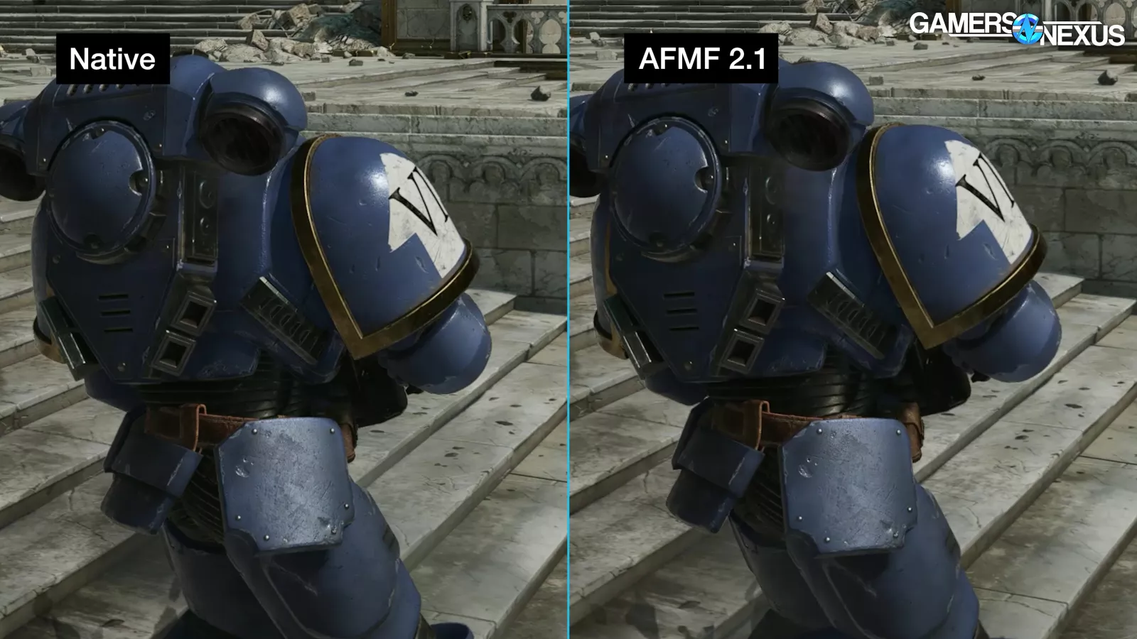 Comparing AFMF 2.0 to 2.1 at similar framerates, 2.1 appears to have less ghosting than 2.0, which should help make the effect less noticeable during gameplay. In each generated frame of the AFMF 2.0 capture, there's a clear secondary image of the marine in advance of the next real frame, as we noted to a lesser degree in the armory scene. Blurring and loss of detail can be issues, but ghosting is a much more visible downside of framegen and one that can ruin the experience.