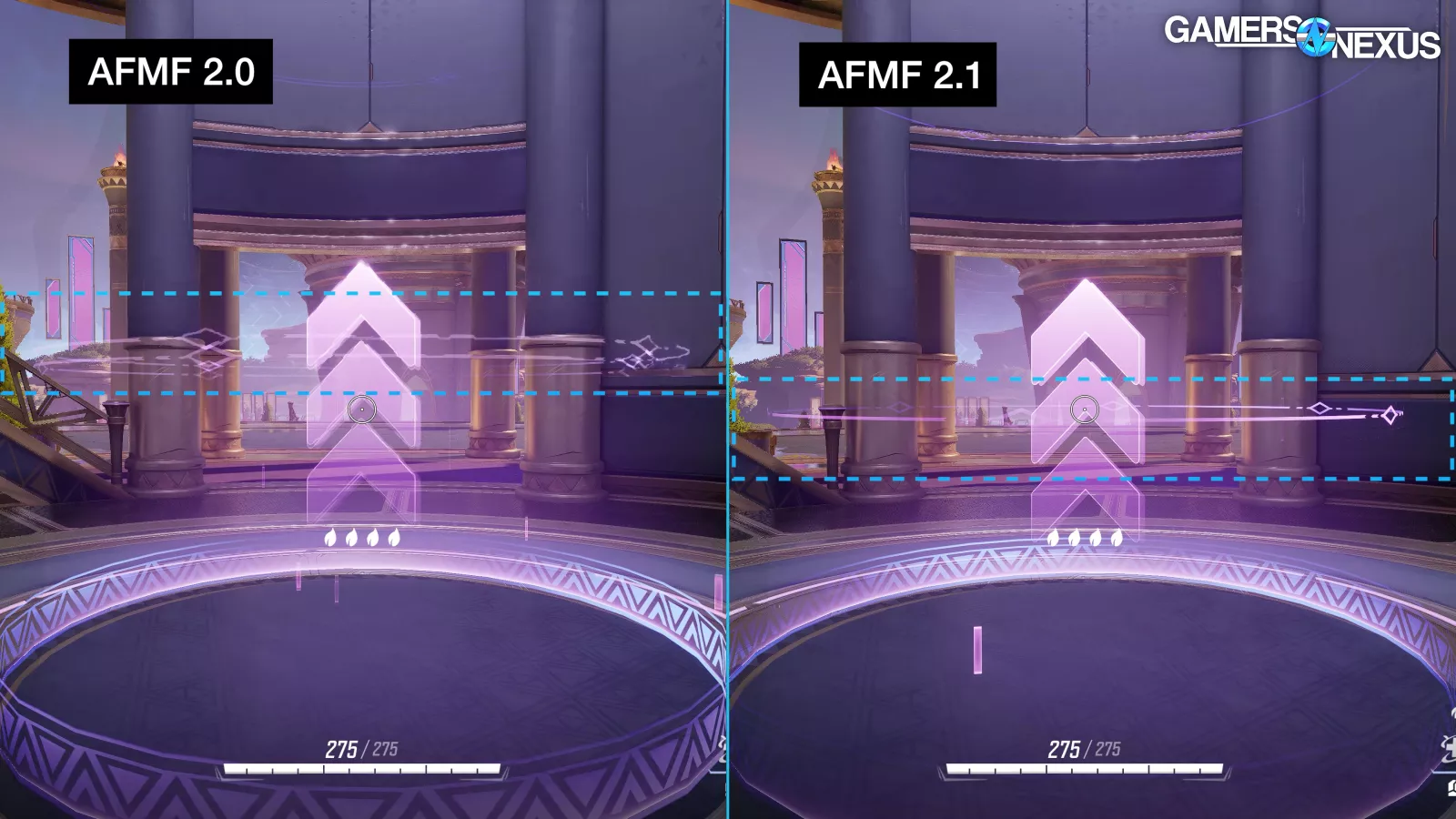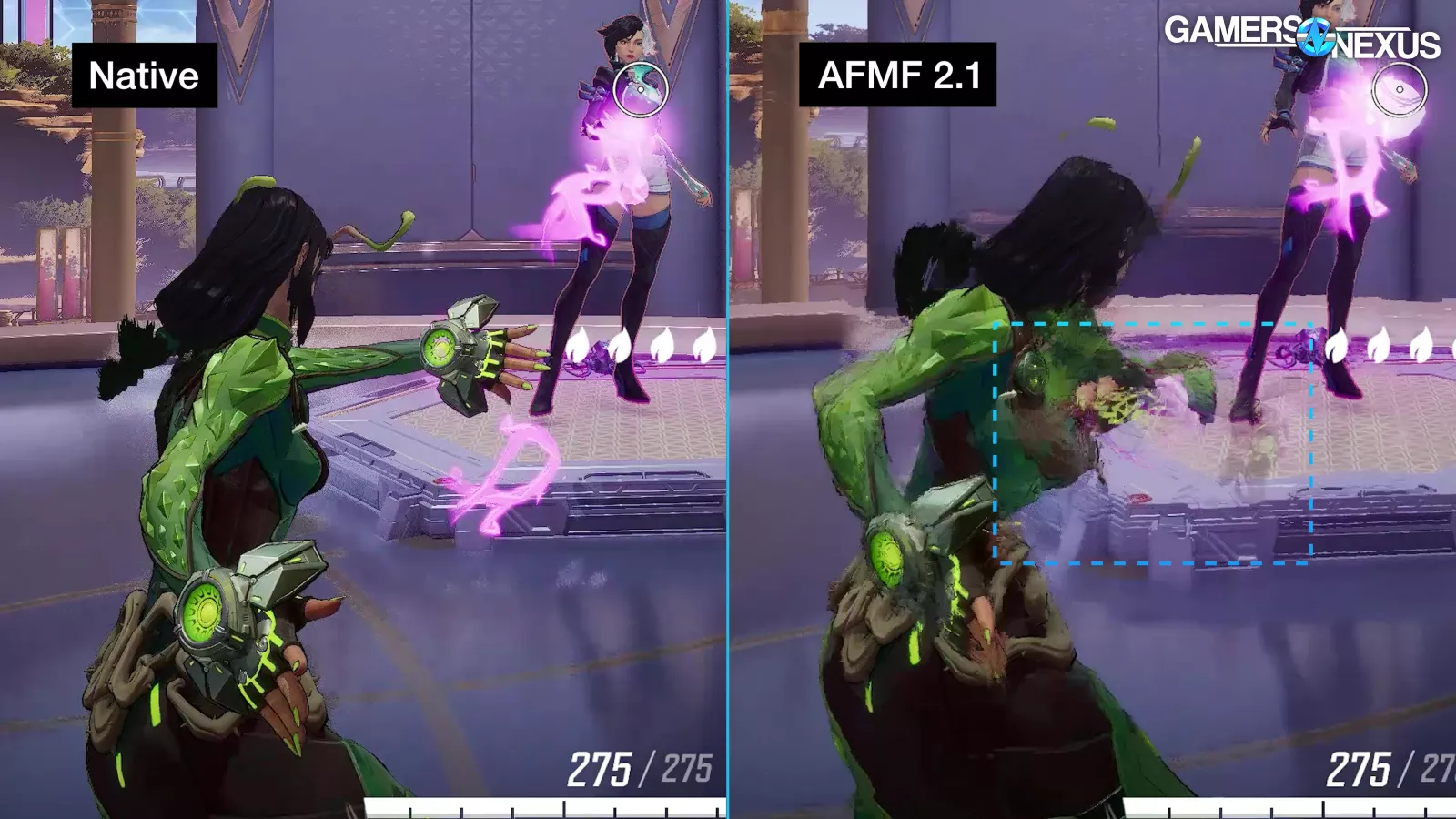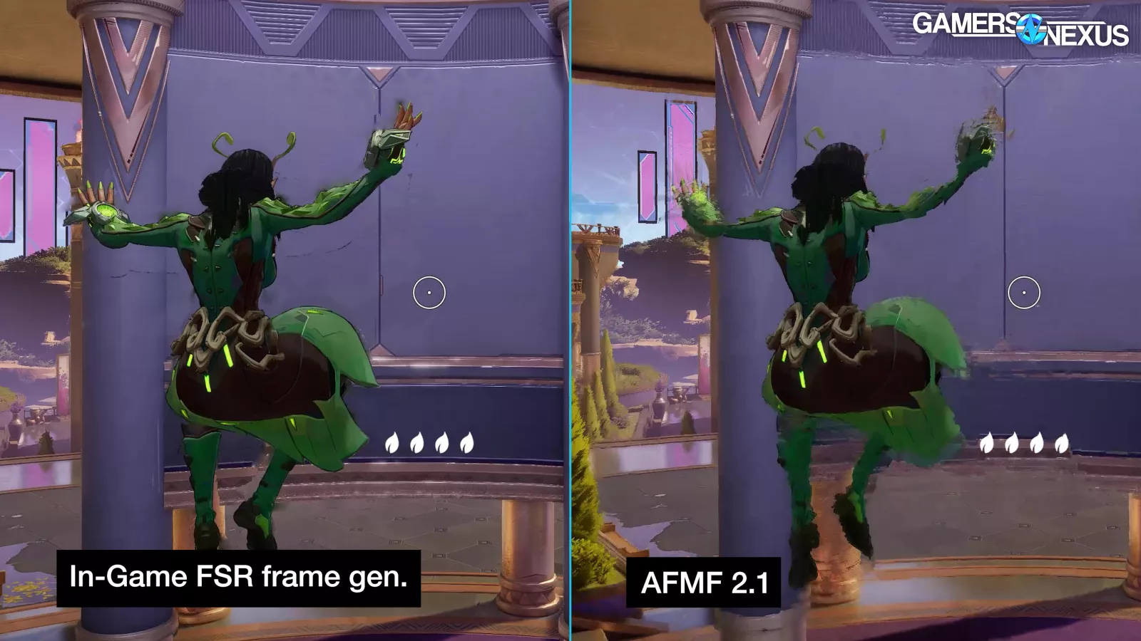 In this scene, we can see distortion around Mantis' hands with AFMF 2.1 in advance of the motion they're about to make as she fires, but a rendered frame was buffered in order to generate that image, whereas without framegen, rendered frames are simply delivered when they're ready.